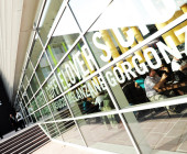 In the left corner of the building we find coffee bar Coffeelovers. From the outside it’s distinguished from the library by large (typo)graphics. It has a spacious terrace, partly hanging over a stream of water alongside the building.