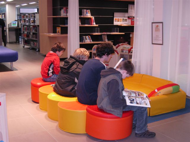 On the ground floor of the library is an open space with books, cartoons, magazines, newspapers and computers with internet access. Different age groups (babies, children, youths and adults) need different places and that’s what they get, but everybody is free to circulate through the whole building.