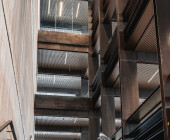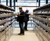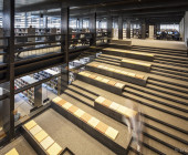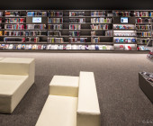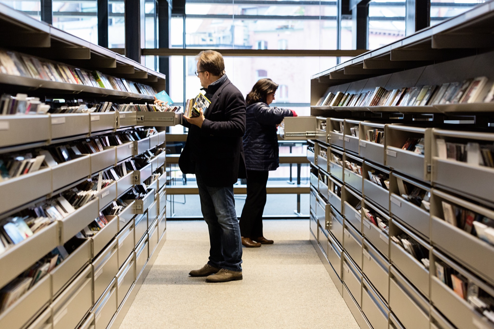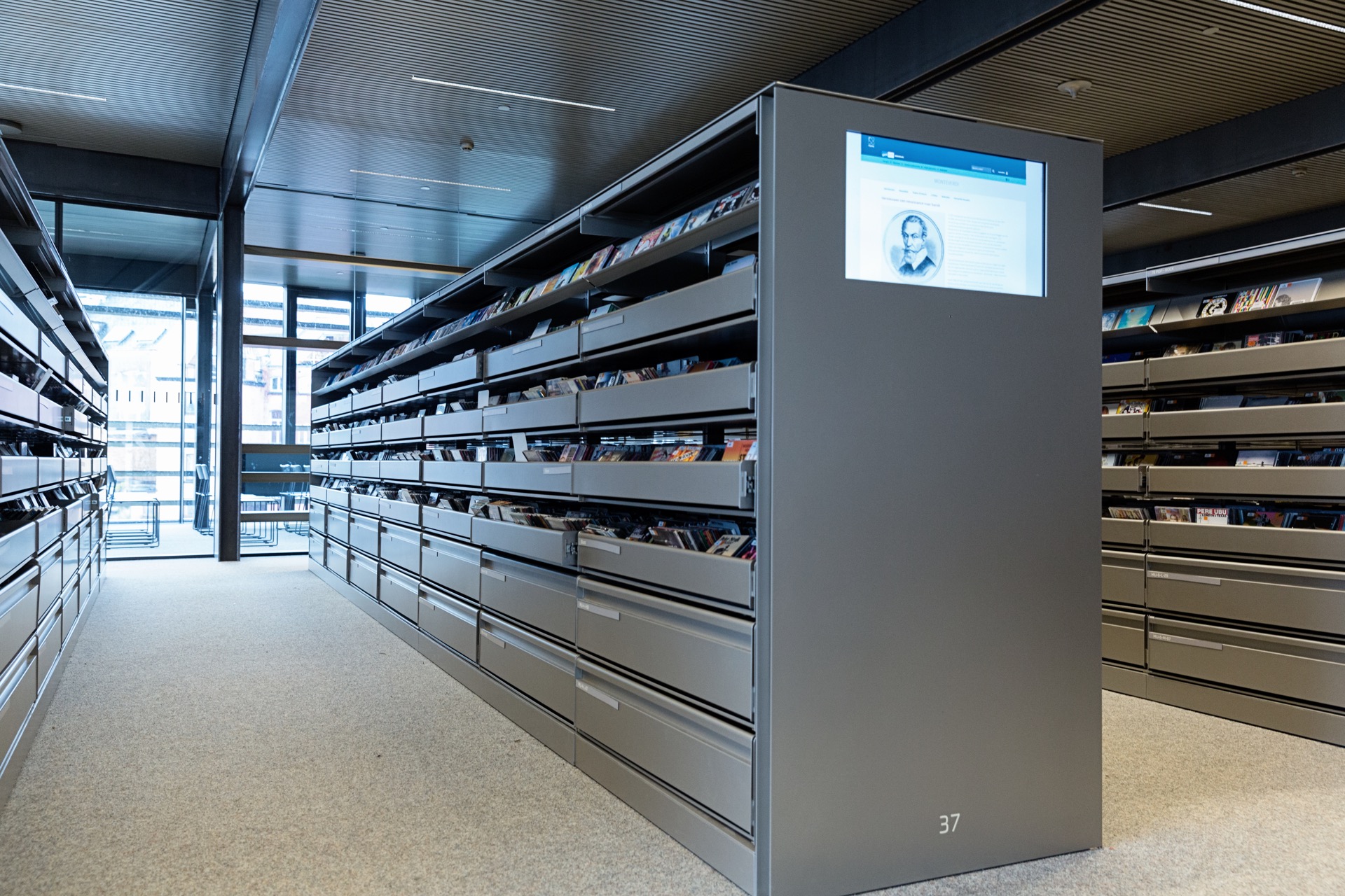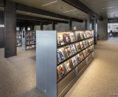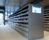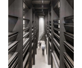 Also, the mechanically movable warehouse racks meet all current comfort standards, but are in fact made up of recovered shelves from the old library.