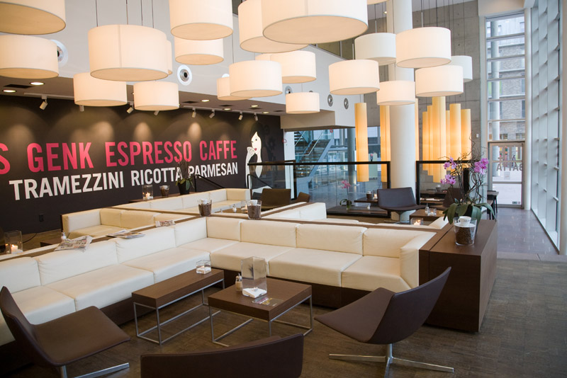 In the left corner of the building we find coffee bar Coffeelovers. From the outside it’s distinguished from the library by large (typo)graphics. It has a spacious terrace, partly hanging over a stream of water alongside the building.