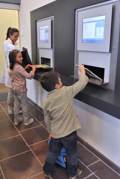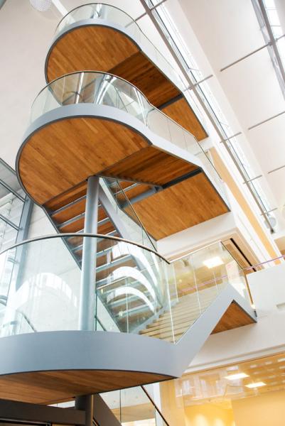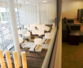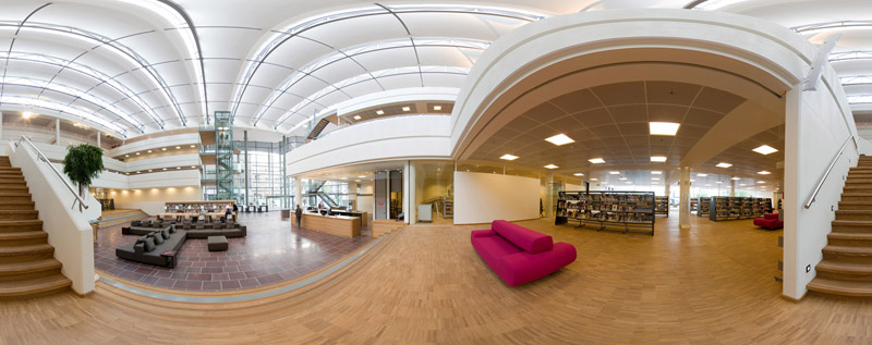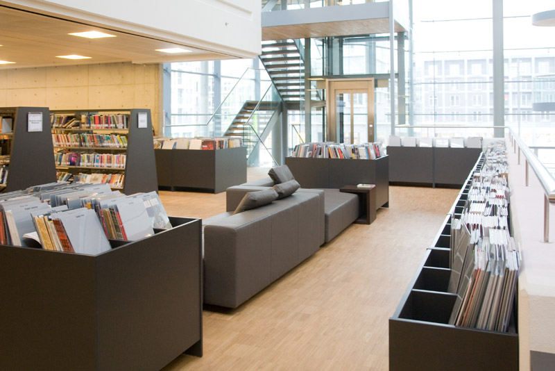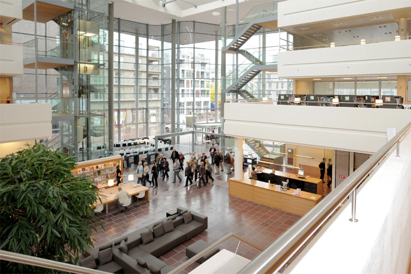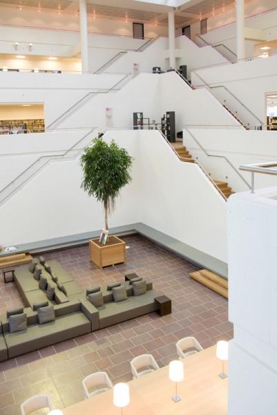 The architect used a lot of glass for the building and installed a large atrium. The result is a library where light and space are the dominant elements. The atrium is the central meeting place in the building, from where the visitors can discover other aspects of the library.