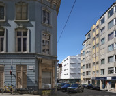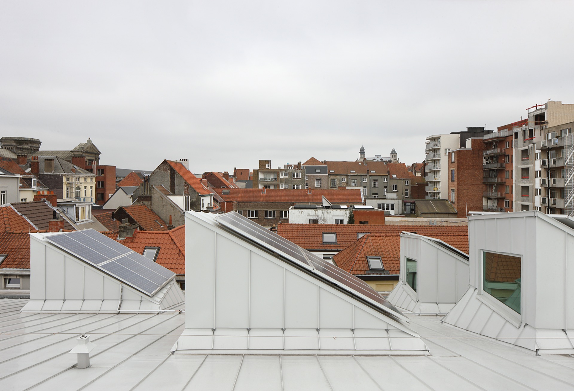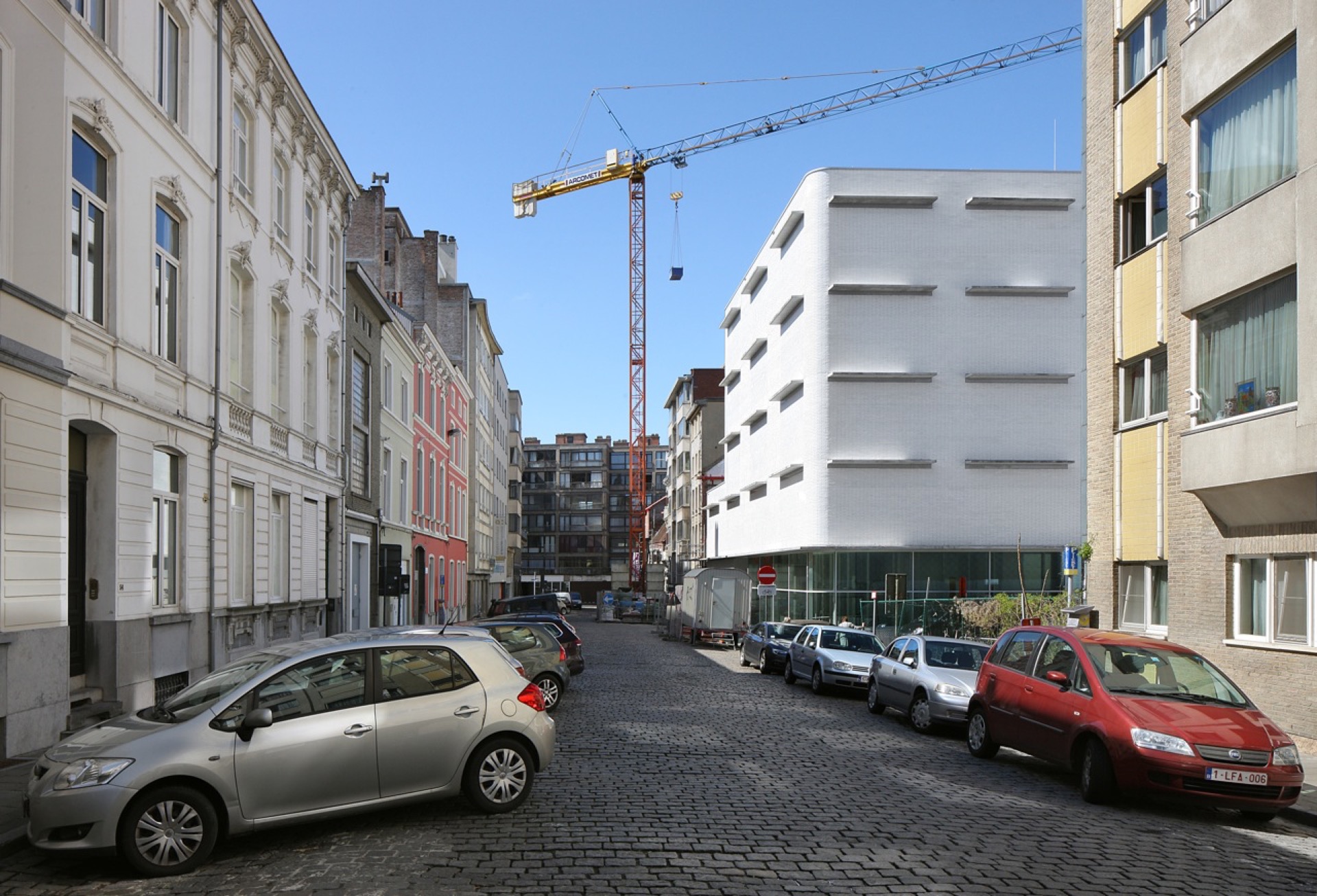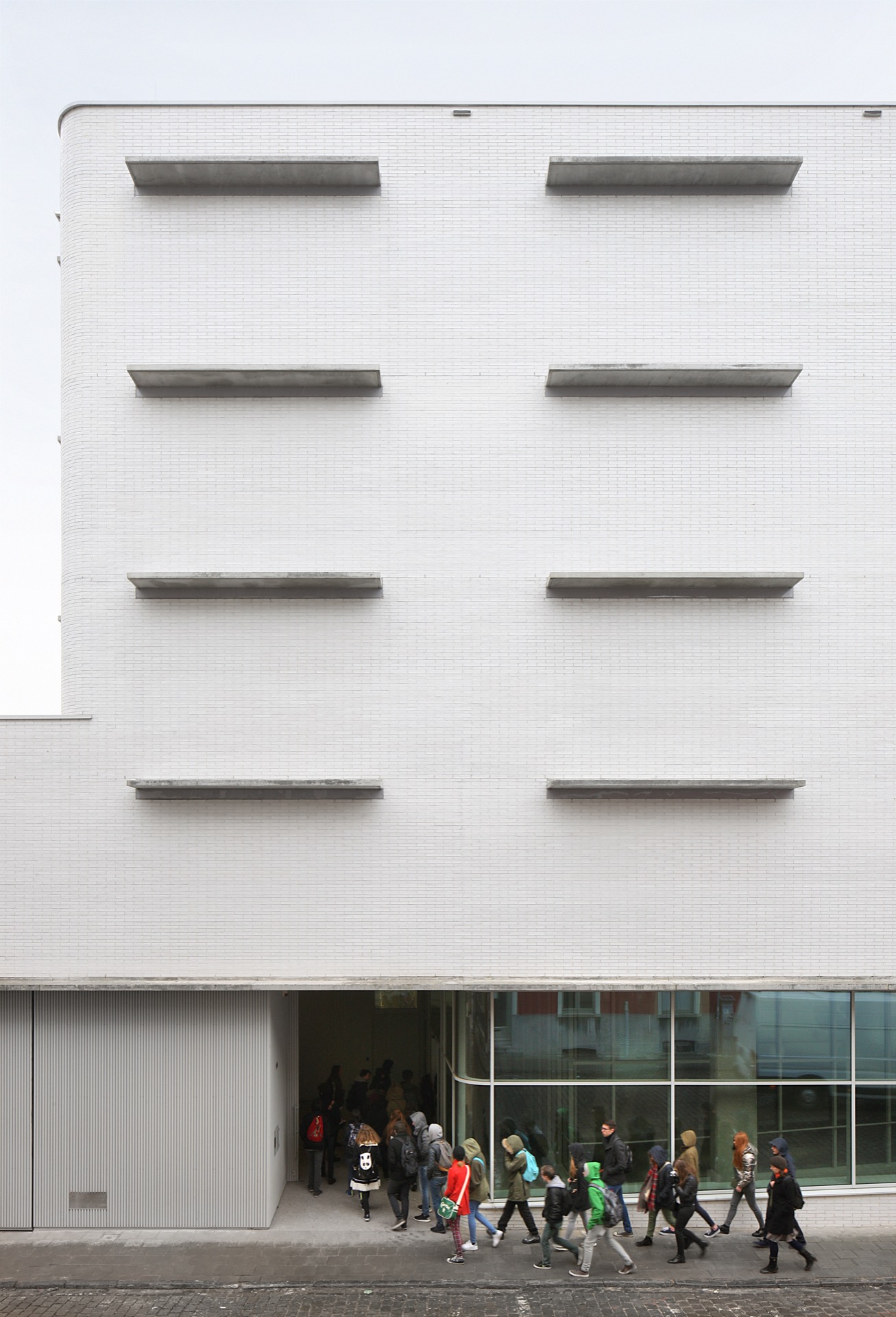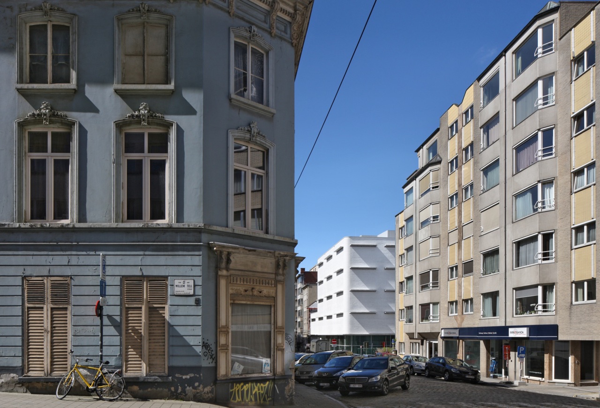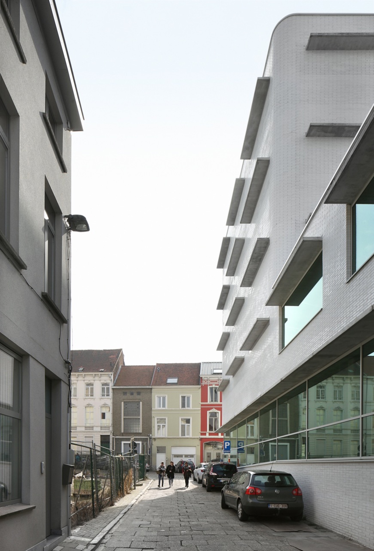 The white brick facades with their pale ceramic layer give the building a light and explicit luminosity in the diverse cityscape and narrow street scene. Their rounded edges of the towering corner volume reference Henry van de Velde’s architecture of the university building a few streets away.