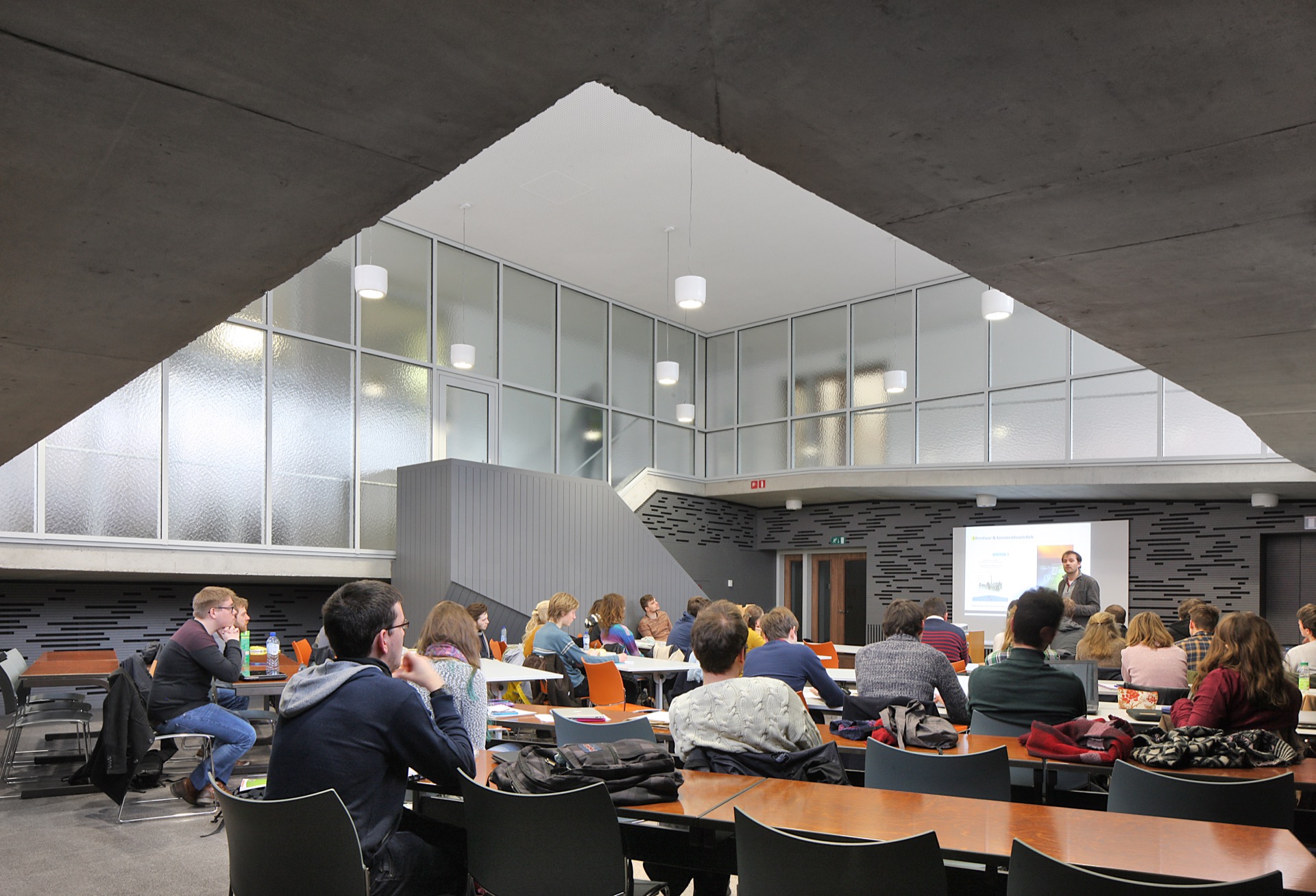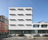 At the base of the white closed volume facing the main street an enclosed auditorium and conference room takes up the critical corner emplacement. It houses a teaching space used for lectures, its walls are lined with custom-made wooden acoustic wall panelling. Together with this lecture theatre, the reading room is used daily by students of the Ghent University. In this way this new buildings functions as a contemporary extension to the already existing university campuses nearby.