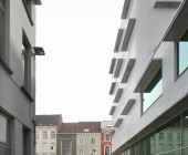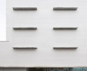 The concrete shelves are repeated above all windows as well as on the blind facades of the towering corner volume. They refer to windowsills, but also to bookshelves or simply shelves. An early design sketch shows these shelves filled with plates, or with small statues and other objects from a museum collection that are never exhibited. They allow for an on-going dialogue with the broader cultural field through specific details in architecture.