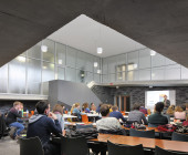 One floor up, the reading room is double height and lit by 17 roof lights that allow natural light to flood in, referencing to traditional studios. The fragmented ceilings of the roof lights are lined with acoustic panelling and hide the artificial lighting and technical equipment. Painted white, they guide the incoming northern light into the room as it floods across the sloping ceiling. A continuous horizontal line at man height runs along all walls of the room, inside and out, and additionally frames windows, doors, storage room and inbuilt furniture. Executed in a wooden acoustic wall panelling finished with a dark walnut veneer, these surface, together with the dark terrazzo floors add to a sheltering atmosphere in the reading room.