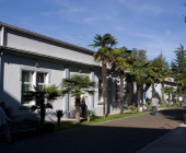 The ground-floor horticultural solutions with abundant grass and flowers create a pleasant and fresh contrast to the colour of the building.