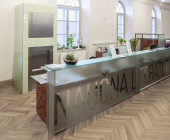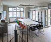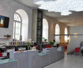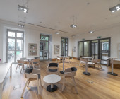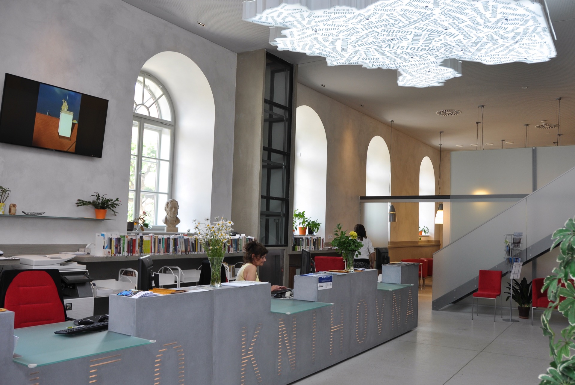 Circulation book stacks are neatly designed in most departments and shelvings are organised vertically to the middle wall. There is a number of study areas along the windows in each department. Design elements, such as modern lighting and furnishing following the colour pattern of each department is what makes the interior so special. It is to be seen in one department the subtle fusion of modern design elements with more than 150-year-old wall painting. There is a café within the library situated right at the entrace with casual dinning venue and outside seating.