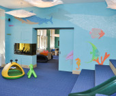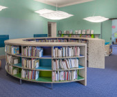 Self-check, round book shelves, changing baby station, 10 thousand of coloured pencils facing wall at the kids department to be used and have fun with, 2 aquariums.