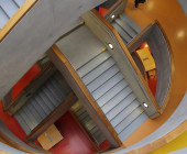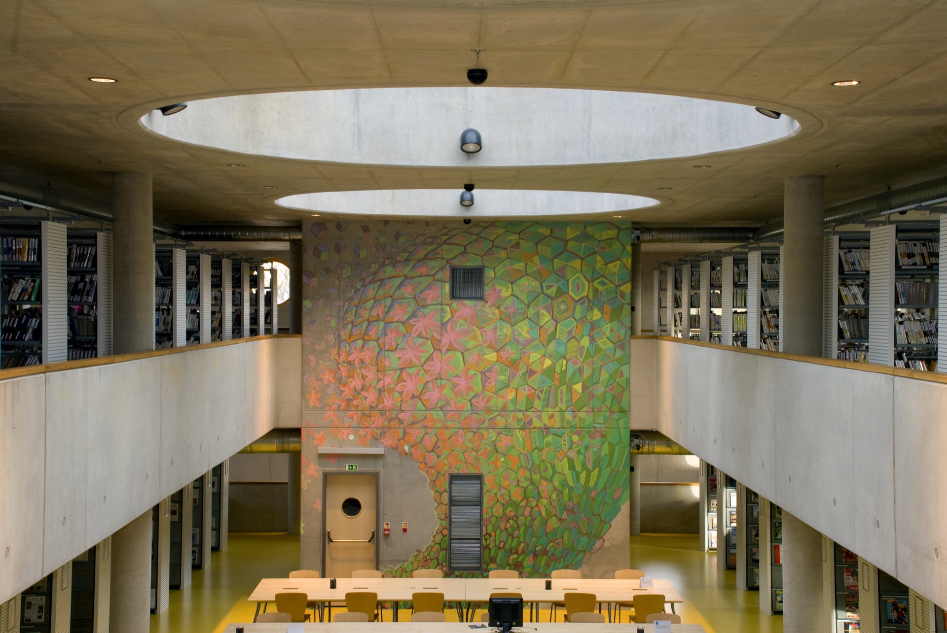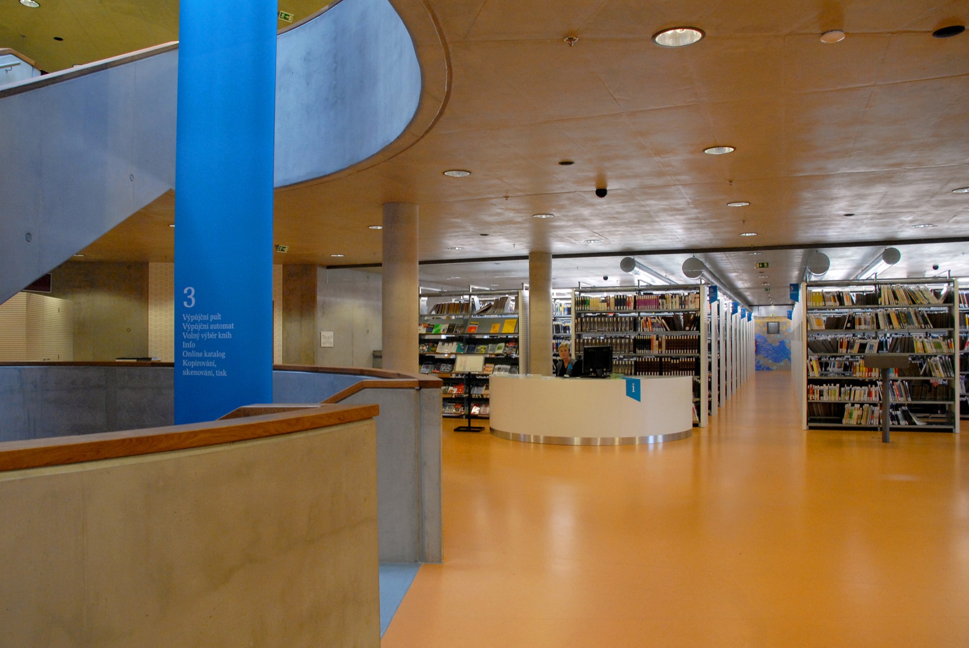 Aims of the project from the view of the librarian and the architect: The architects planned to build a distinctive concrete building of a special X-shaped ground plan – a cast letter. Librarians demanded the construction of a building that allows the operation of modern library services, to separate the zone for the public, from the zone for employees and warehouses. It succeeded – the meeting points for the public and employees are the circular halls around the staircase.