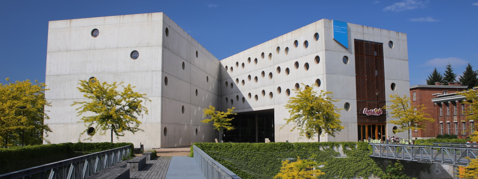 Gallery, 2 exhibition areas, conference hall, classrooms and café are also parts of the Research Library in Hradec Králové.
