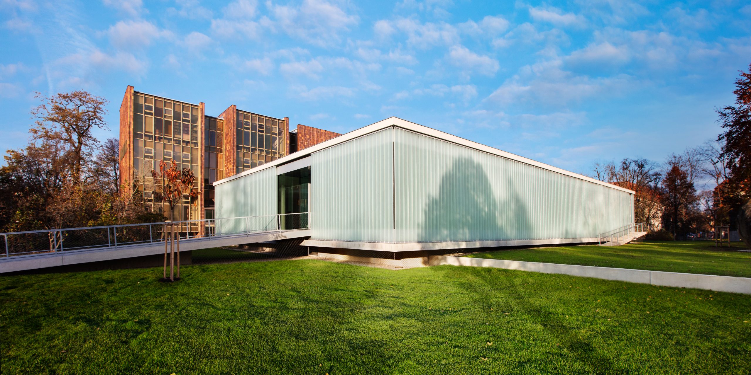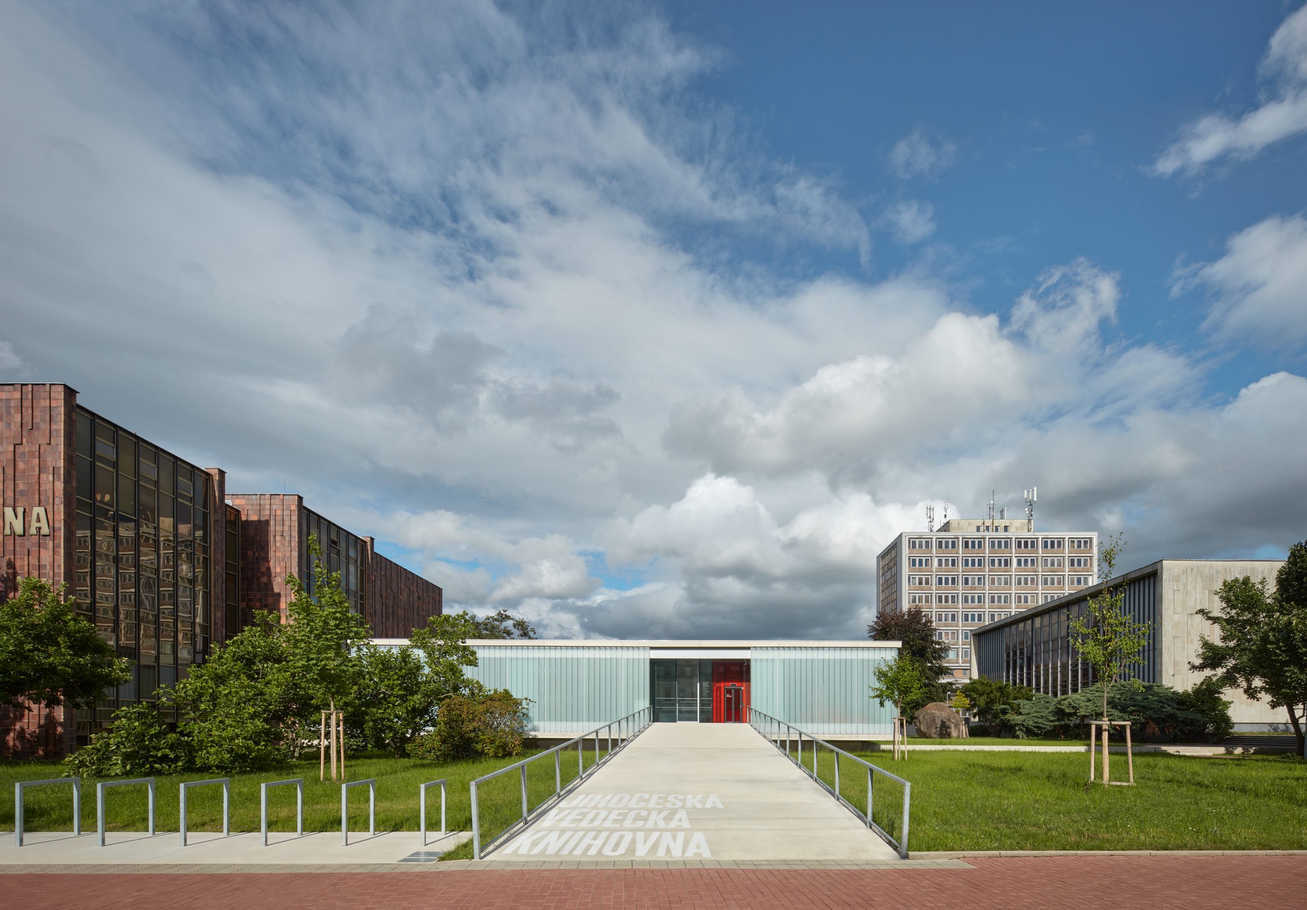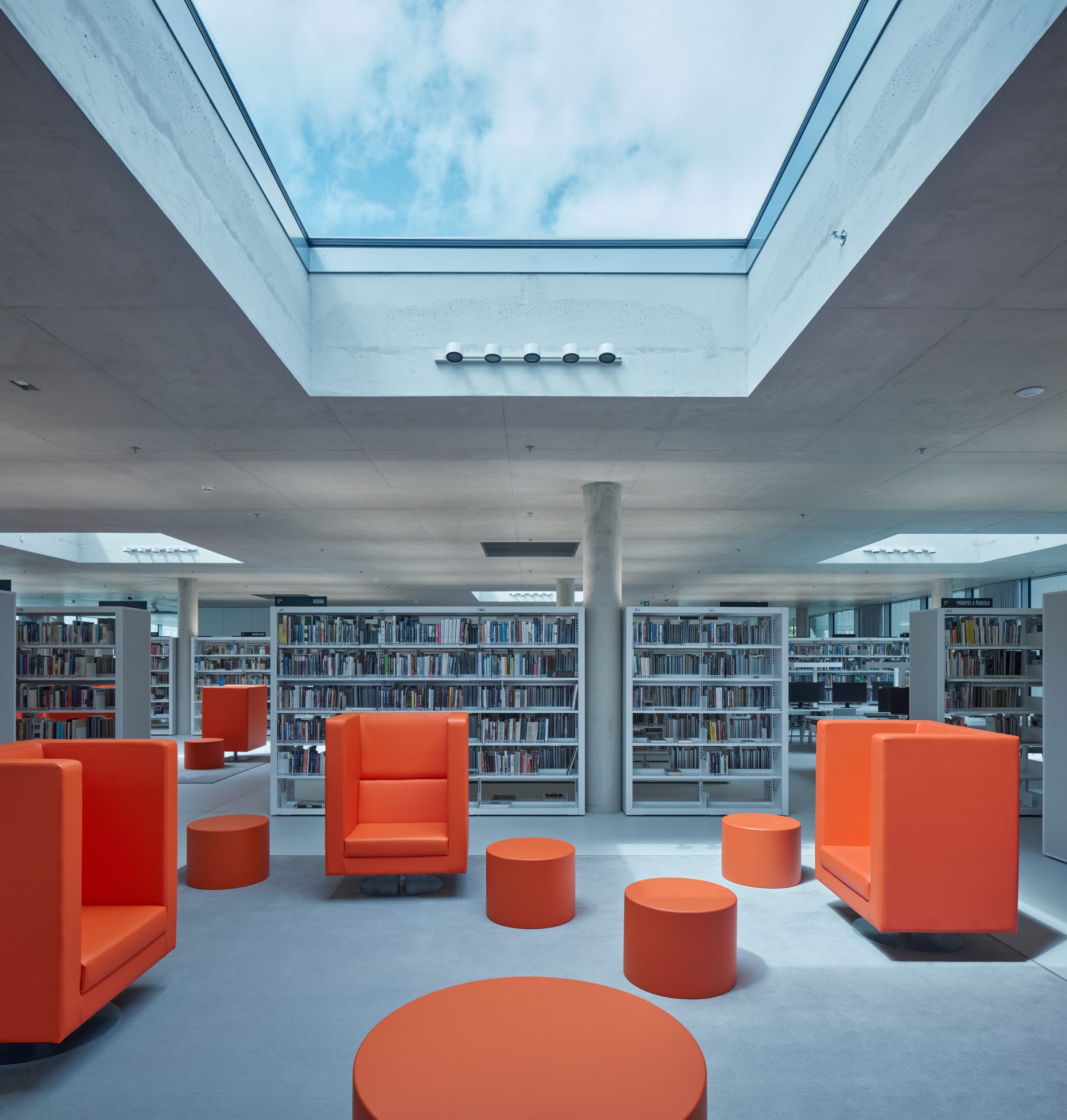 The intention of the project was to create a space for free choice by combining the newly built extension and the reconstructed 1st above-ground floor of the existing building. The winning design emerged from an architectural competition and, in addition to the requirements of library operation, had to be based on the conditions of historic preservation, the building is located in the protection zone of the city’s historic preservation. The winning proposal included an extension in the form of a “levitating” one-story addition, which is connected to the original building only at the point of the former entrance.