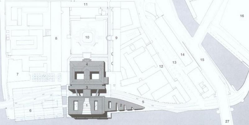 The bluprint from above shows how the new buildings 1 (Black Diamond), 2 (The Fish) and 3 (Hansens Building) are situated in the old part of Copenhagen. Building 4 is the old library and no. 10 is the old library garden.