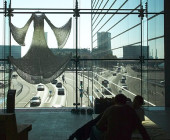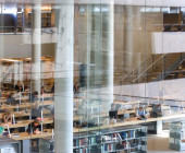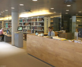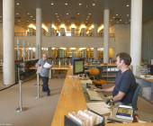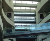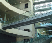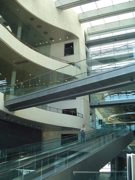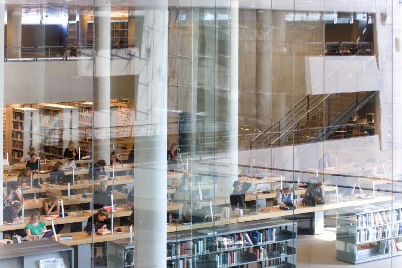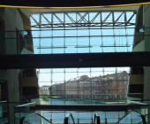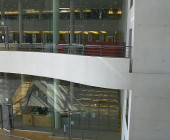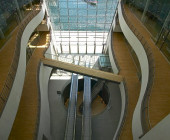 The seven stories of the building contain not only traditional library functions such as the four new reading rooms, but also a concert hall, exhibition galleries, bookshop, café and restaurant. The ceiling of the bridge between the old and the new is decorated by the Danish artist Per Kirkeby. In the old building of The Royal Library a Jewish museum has been designed by Daniel Libeskind in 2004 with sloping floors and light wooden interior.