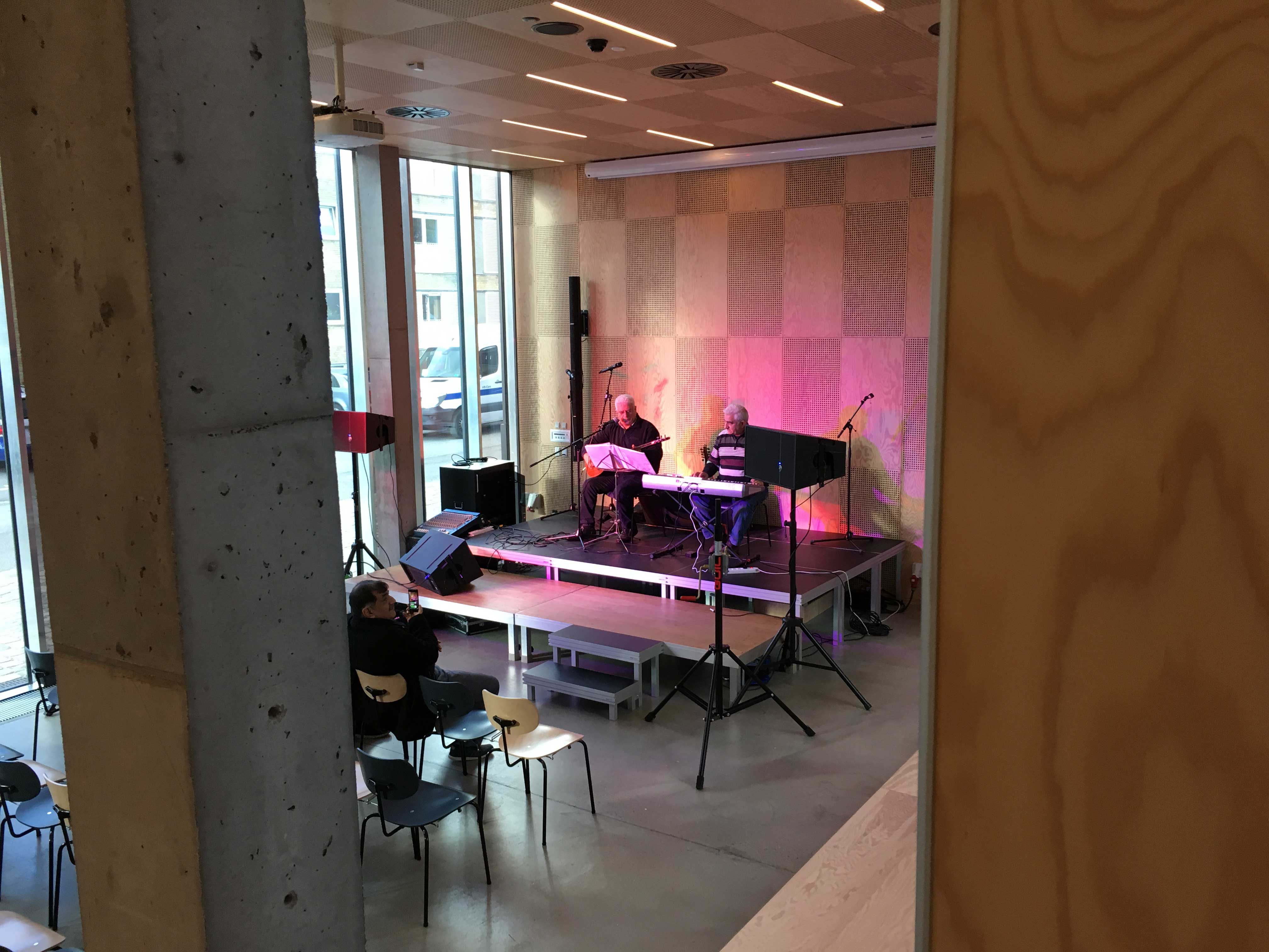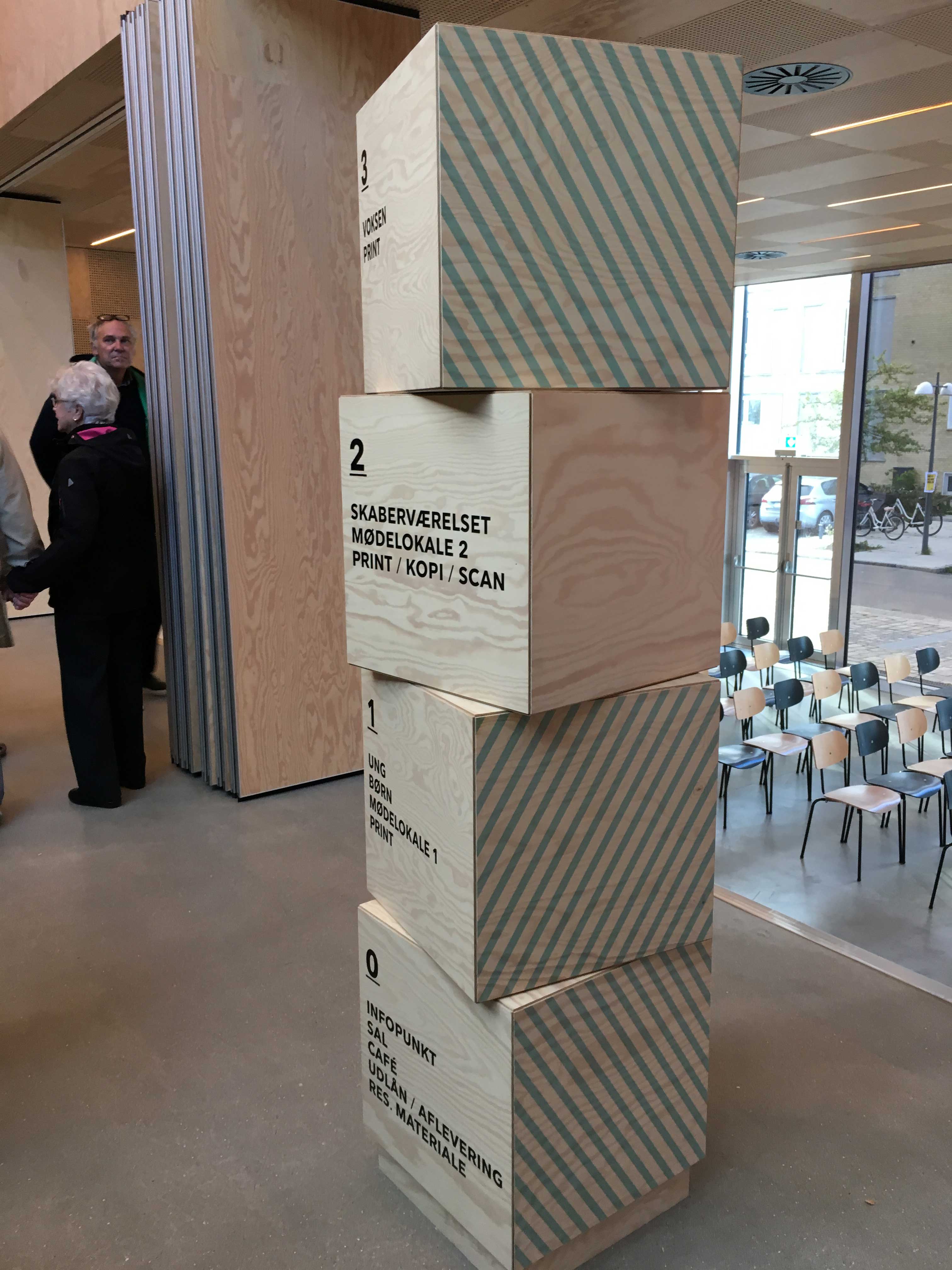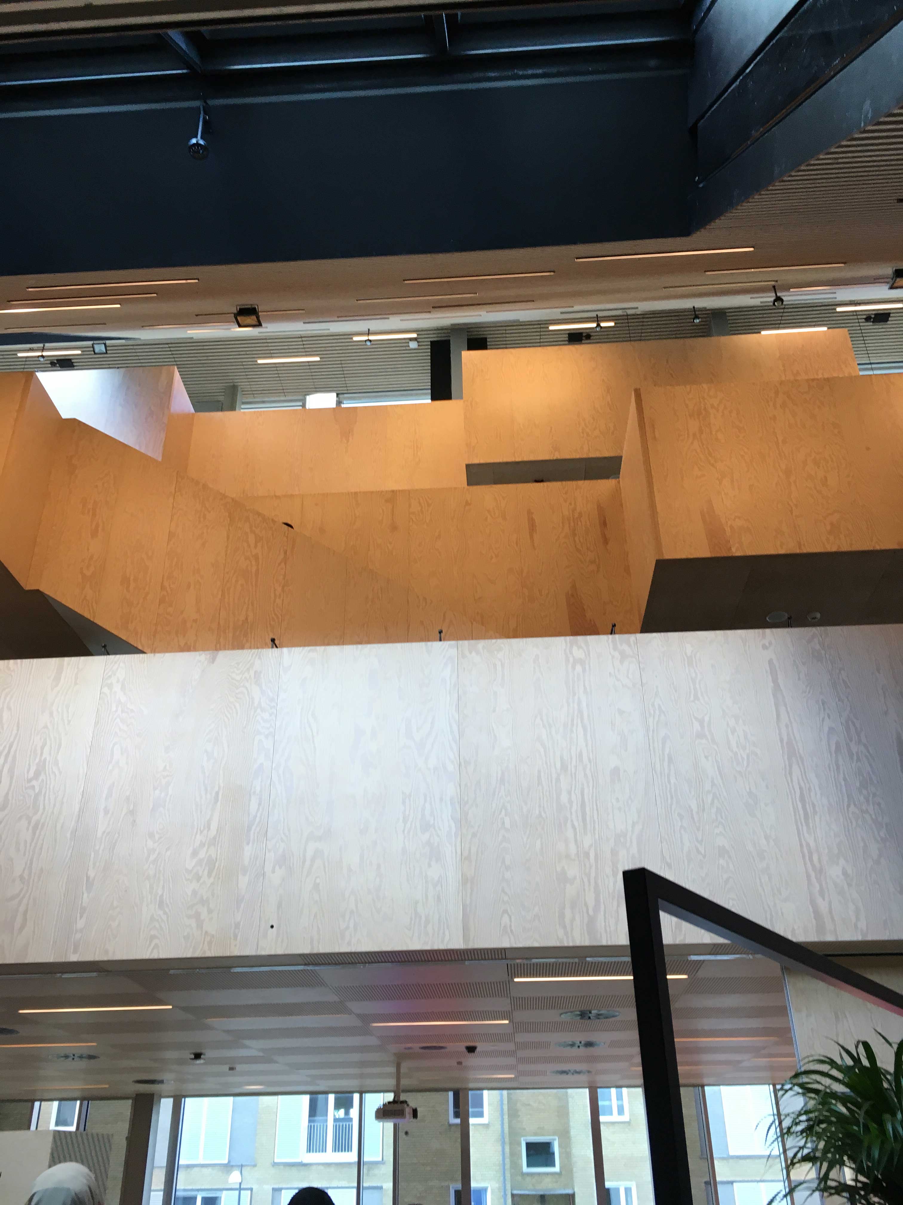 On the ground floor / basement you find a concert hall combined with the pick-up area for books. On the first floor is an area for café, makerspace, sowing and joiners' workshop. On the top floor you find a few bookshelves but most books are away at remote storage.