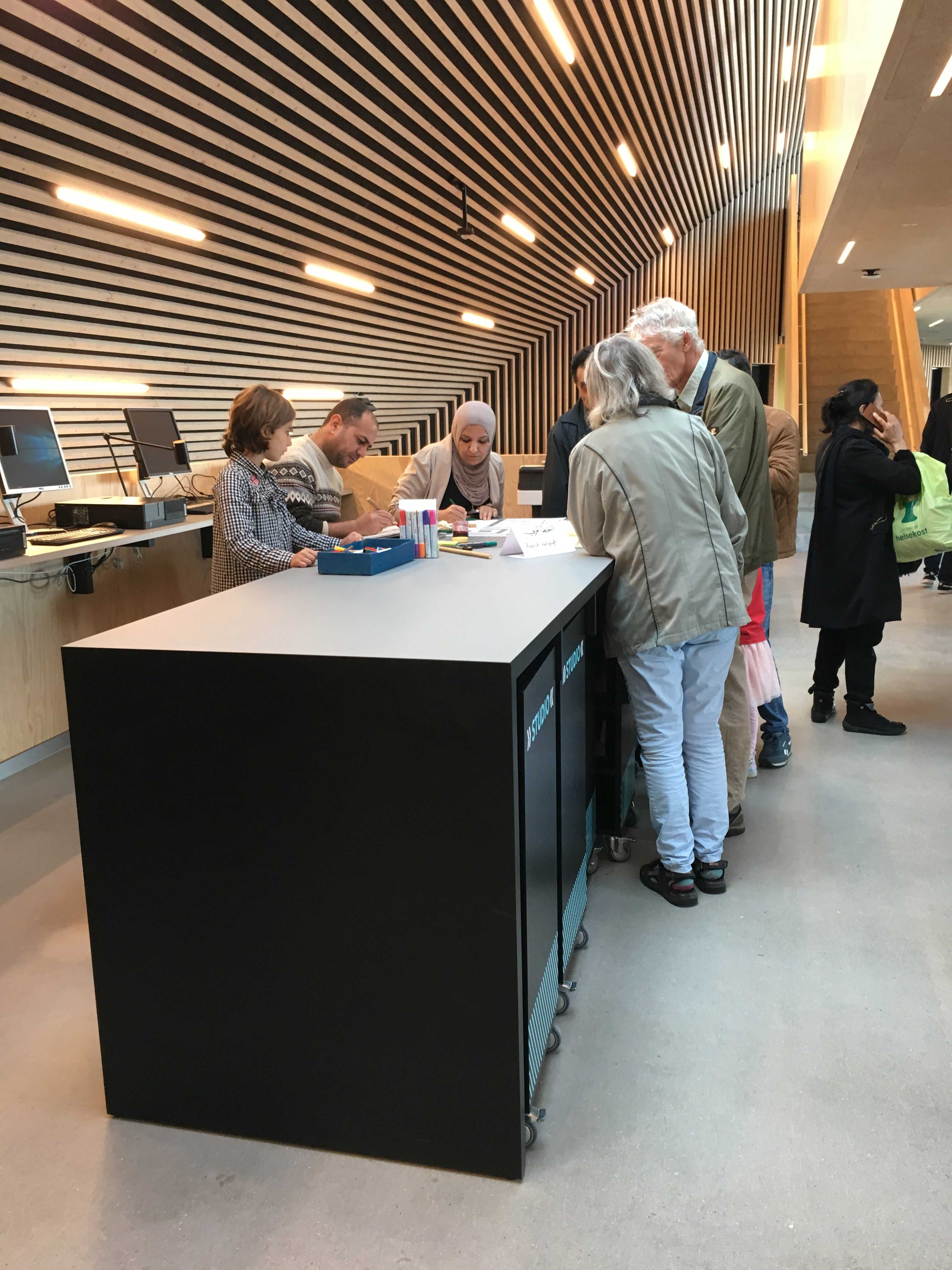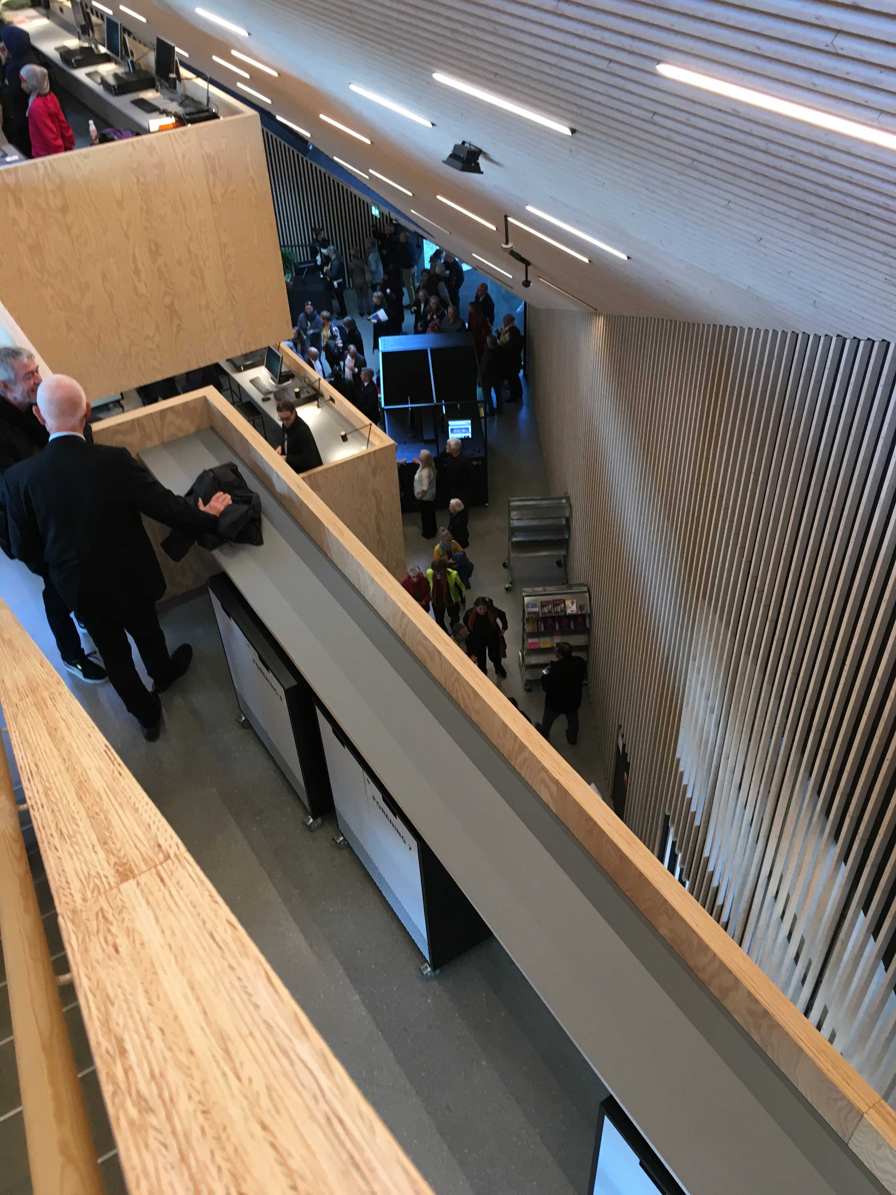 The view from the top floor is very beautiful both in and out. Apart from a few meeting rooms everything is open and connected. The idea is that local inhabitants will have access to the building at all hours using their Civil Registration Card as admission. Contact with the librarian outside the normal opening hours can be reached via the screens or by phone.