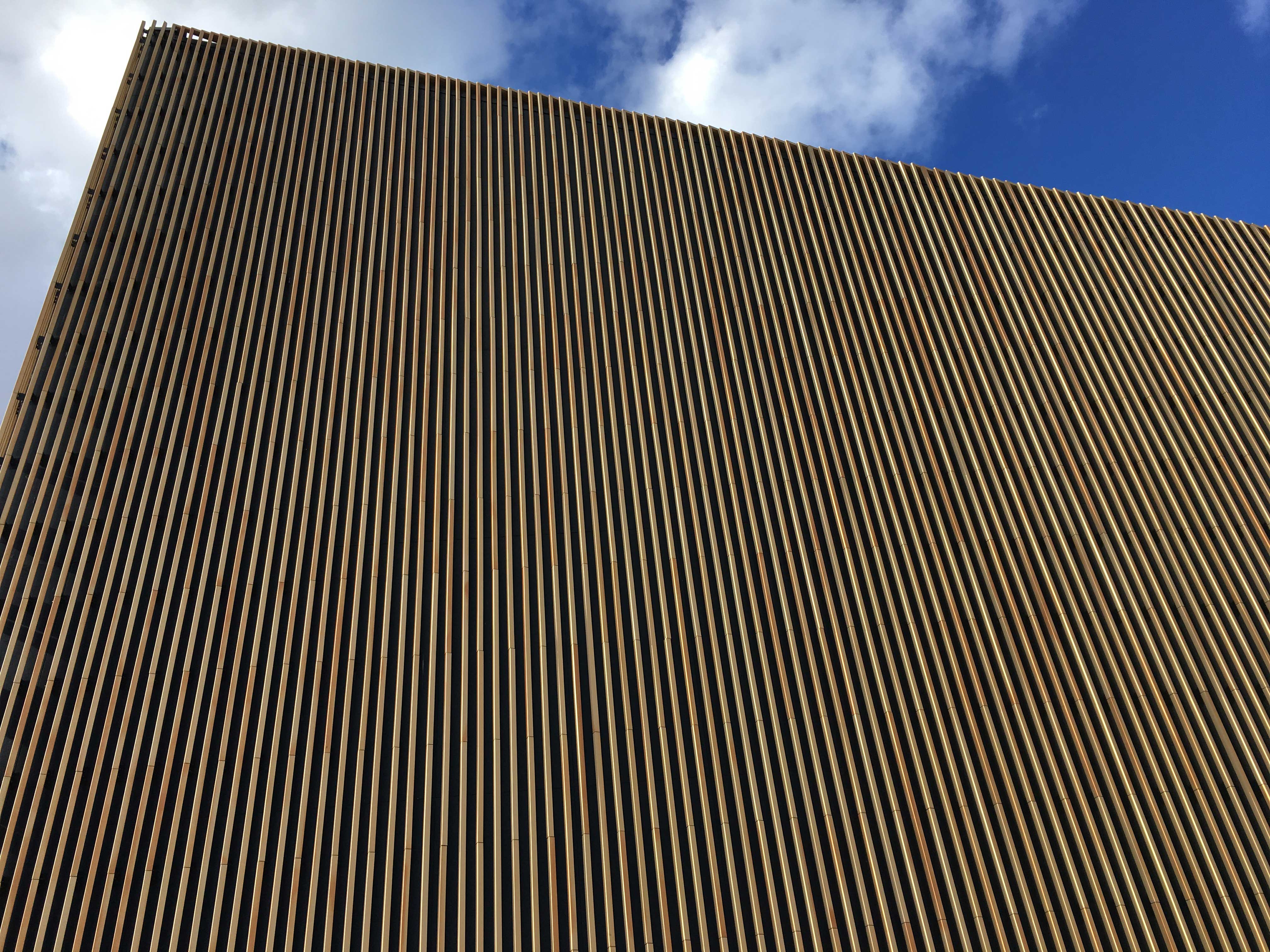 The building has been nicknamed 'the ghetto blaster' or 'the flat screen'. It is more or less a triangular building with one glass facade.