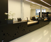 The interior decorator Katrin Kaevats tells in the magazine „Raamatukogu“ that the interior design of Nurmenuku Library springs from the general design of Haabersti Leisure Centre. The design of the library is spacious, fresh and bright and preferably with a little reserved eccentricity rather than too serious. All mentioned is made with bright walls and floor, black bookshelves with soft sides, chairs in different shapes and colours, some modern veneer tables with holes (where You can put Your pencils, for instance ), blackboard wall, curtain in the children’s reading area, mysterious light from the circulation desk (only special effect made with the light) and soft pillows on the stairway.
