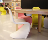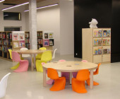 Nurmenuku Library’s service ground is 608,7 square metres. New modern interior decoration, cool chairs, sitting pillows on the stairs enable everyone to feel comfortable while spending time at the library. Children can use the white curtain in the children’s reading area to make themselves a small library of their own, where it is fun to be with their friends and discover the world of books. On the blackboard wall everyone can demonstrate their drawing skills in chalk. In summer it is possible to read a book on the library’s balcony, if the weather permits.
