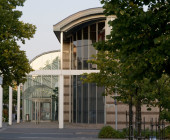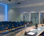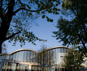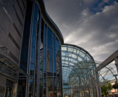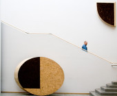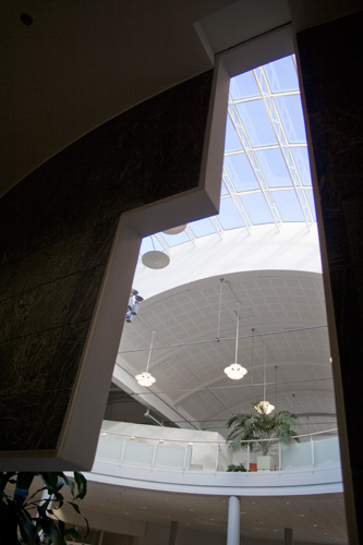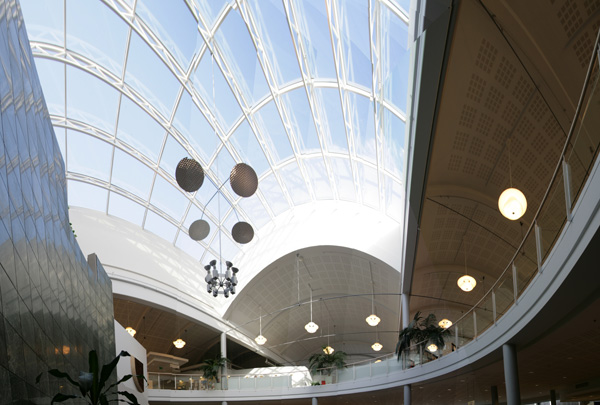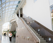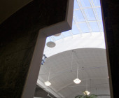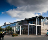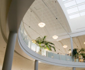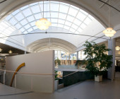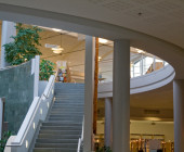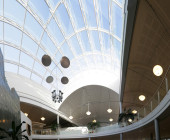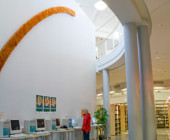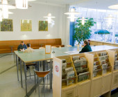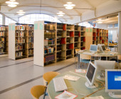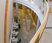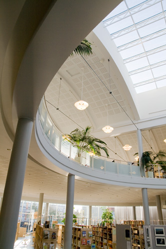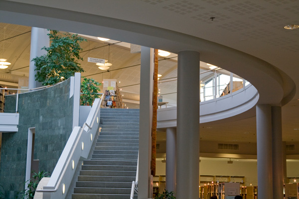 Curved shapes, light colours, and airy spaces separated by glass walls are characteristic of the architecture, and a large window wall opens to the terrace. A central market place helps customers orientate themselves and creates an open area through which the library can breath. Moving from one department to the next is easy, because there are partition walls only where peace and quiet is needed. The physical space is clearly seen as an important counterbalance to the virtual world of digital culture.