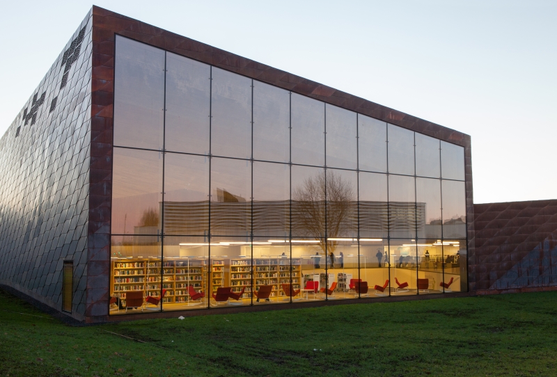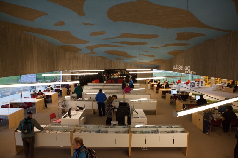 The new main library of Seinäjoki was opened to public on the 20th of August 2012. The library was designed by JKMM Architects from Helsinki. The library is also the provincial library in Southern Ostrobothnia. There are almost 60 000 inhabitants in Seinäjoki and the city is large in surface area. Collections in the main library consist of 250 000 items.