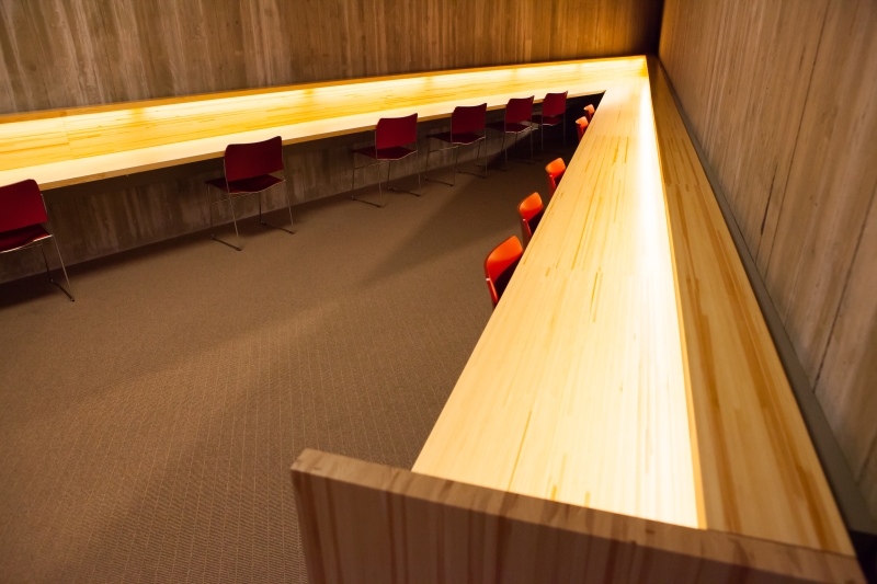 The shape of the building has also been influenced by Japanese origami, there are for example a lot of sharp edges in the building. There is a lot of untreated concrete visible inside the building and as a contrast to the concrete there are a lot of white in the ceilings and the furniture is colourful.