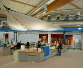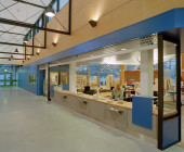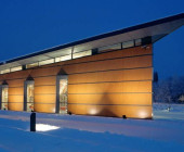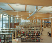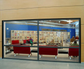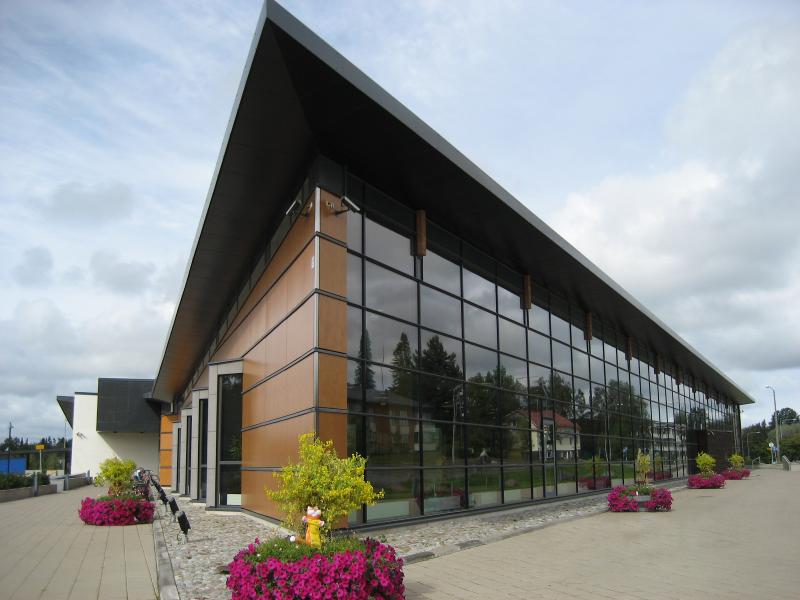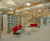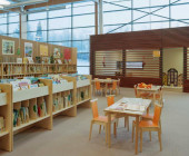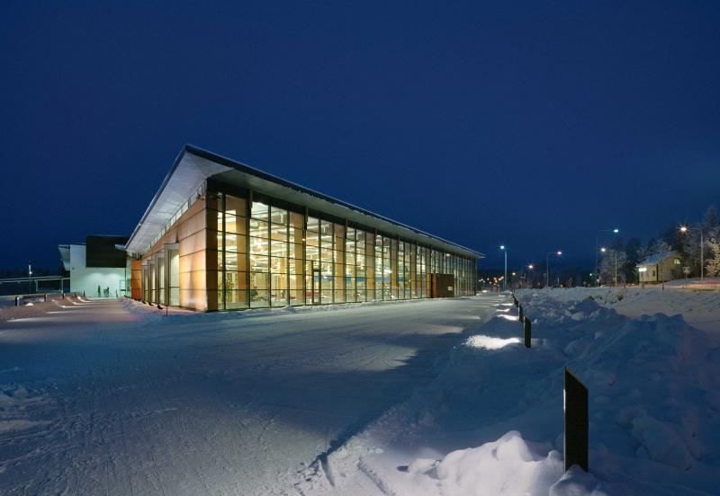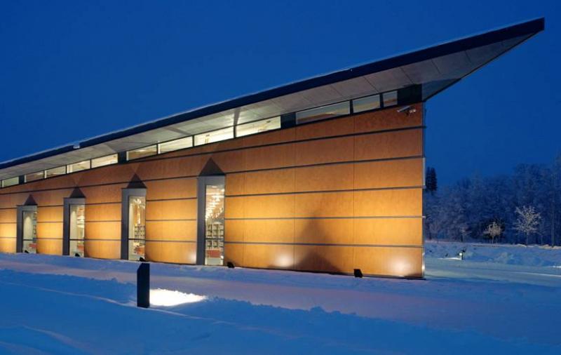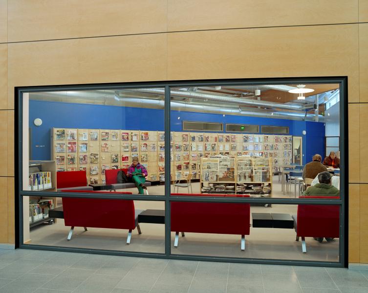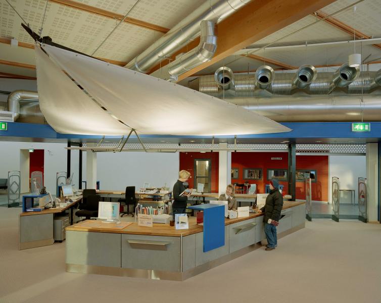 The Ylöjärvi main library “Kite” was opened to the public in November 2002. The building is centrally located along the busy main street Kuruntie and it fits harmoniously with the surrounding fields. The library consists of two large triangles, and the avenue between them divides the spaces into those for patrons and those for staff. The interior was designed to be spacious and sunny: a long glass wall is facing Kuruntie. The main colour inside the building is warm light brown accentuated with bright blue. Kite-like features, like the triangular service point and the shape of the roofs, have been used in the architecture. The facade is made of yellow plywood sheet.