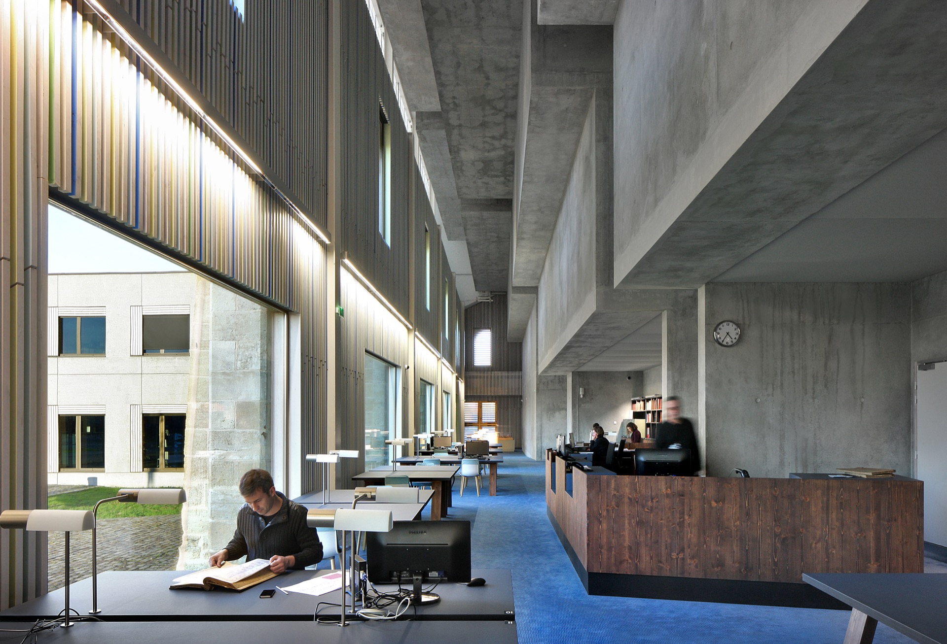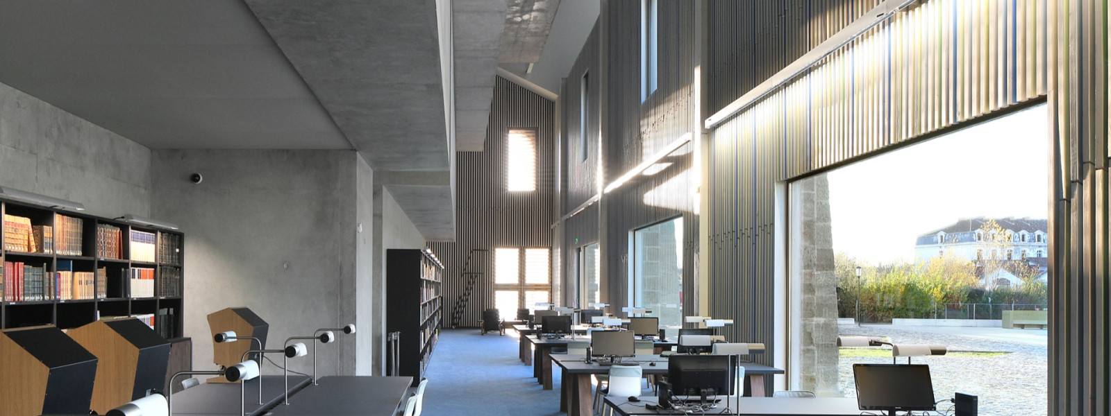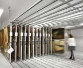 The integration of archival facilities within an adapted 19th Century structure is a highly complex technical matter, which demonstrates our commitment to environmental sustainability. Here, the principal of a ‘box in a box’, with a low supply of fresh air and the high inertia of new concrete construction guarantees the climatic stability of the archives. The basement of the landscaped forecourt is the plant room for a geothermal system which, coupled with heat pumps, provides heating, cooling and dehumidification at an extremely low energy cost, utilising the constant soil temperature.