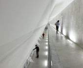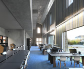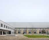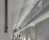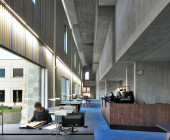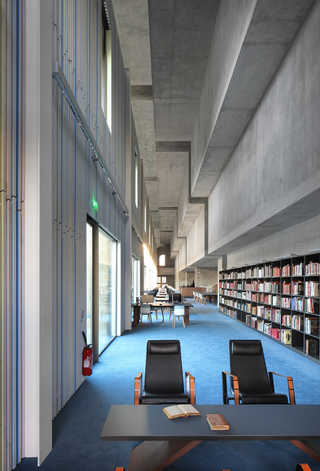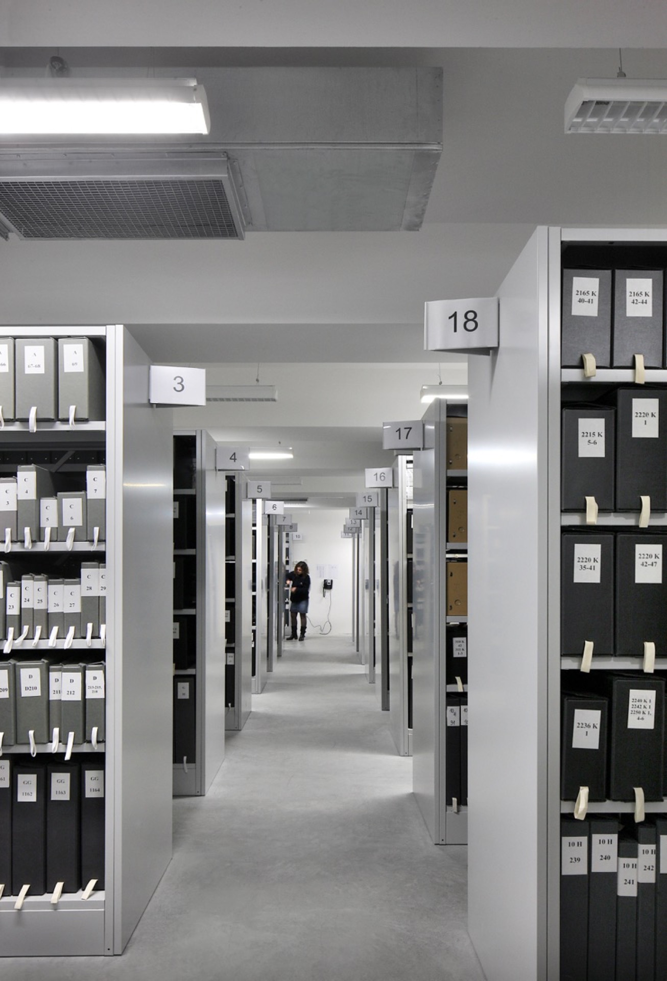 The industrial history of the site acquires a new interpretation: the storerooms, where the archive boxes are housed, are stacked in the exact location where goods were previously stacked. Each concrete box slides into cantilever above the reading room, which is located on the north side of the building, making the presence of the documents palpable. On the south side, the stepped form of the storage boxes supports the internal circulation of staff. A new perpendicular volume is created for the associated functions: reception, exhibition space, educational workshops and auditorium on the ground floor, offices and restaurant on the first floor. The reading room and the offices have a view onto a landscaped forecourt, which is accessible to everyone.