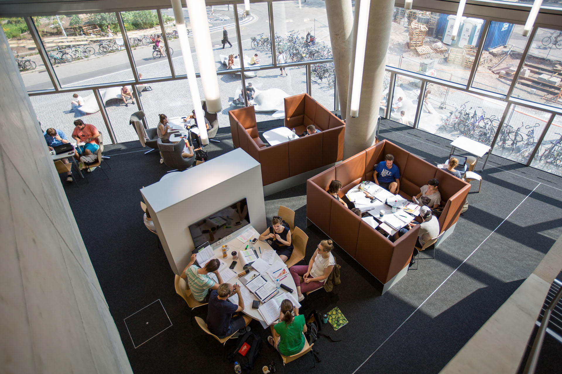 The number of study spaces available was to be vastly increased, and a much more diversified and differentiated study and research environment planned. Quiet study spaces in the reading rooms and the access to the open stacks on the one hand were to be kept strictly separate from the necessarily louder and livelier group work areas and learning lounges (called “Parlatorium”) on the other.