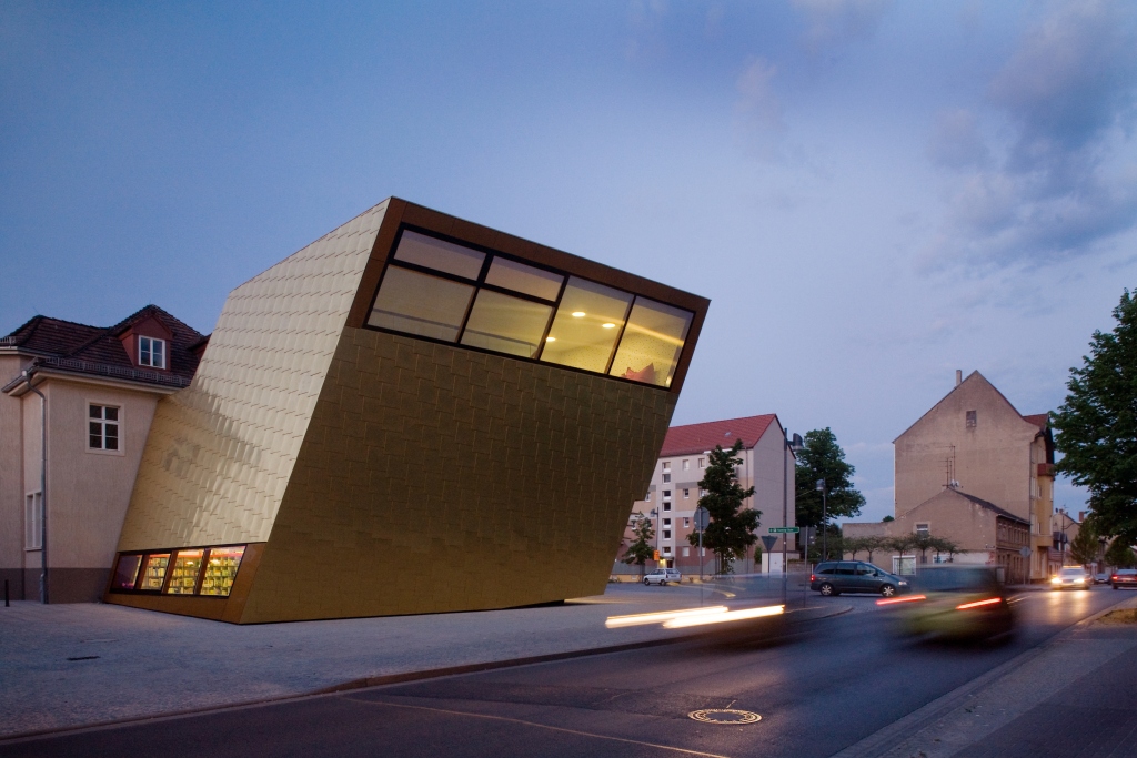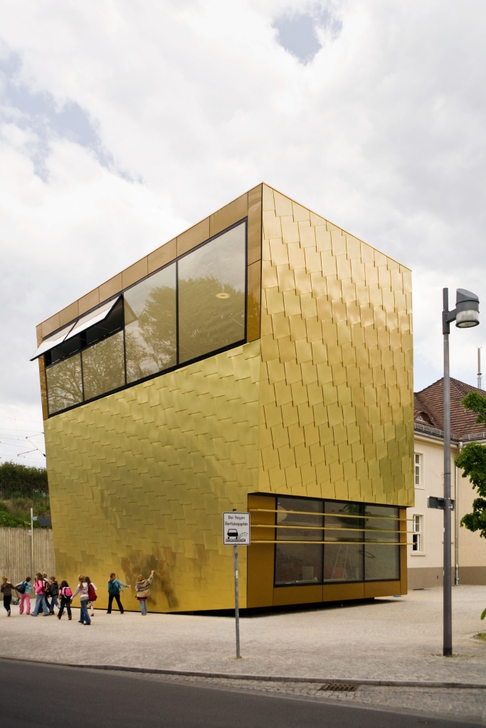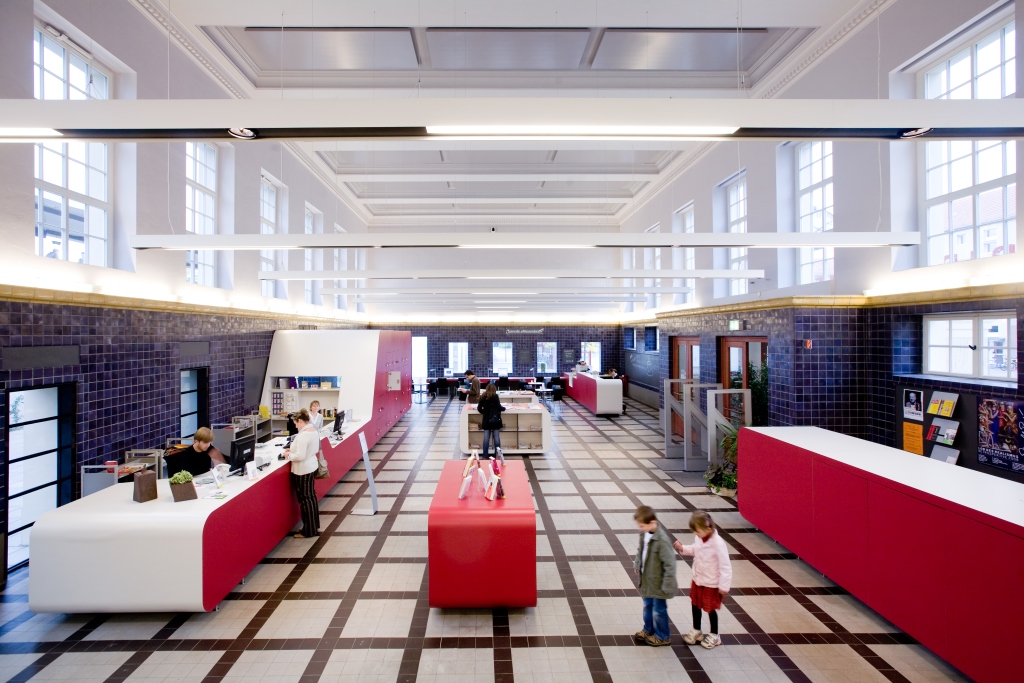 The listed railway building is being supplemented with a rectangular shaped annex tilted along two axes that has the effect of repositioning the railway building in its urban context. The striking facade design with its shimmering golden, imbricated surface underscores the accentuation of the structure in urban-planning terms. The interior of the annex presents children and young people with a series of spaces shaped to accord with the needs and desires of the library's younger users.