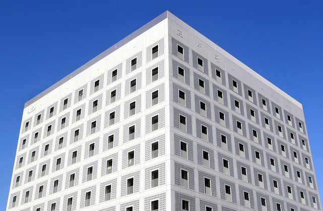 The façade consists of 9 x 9 panels of glass bricks in a frame of light grey exposed concrete.