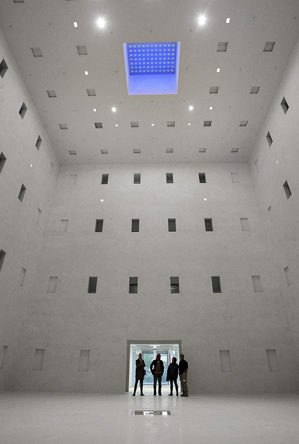 The cube-shaped space is lit by light from the central opening (oculus). It is surrounded by staircases fromthe ground floor up to the 3 floor.