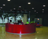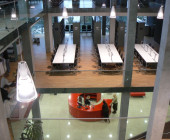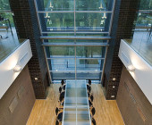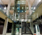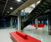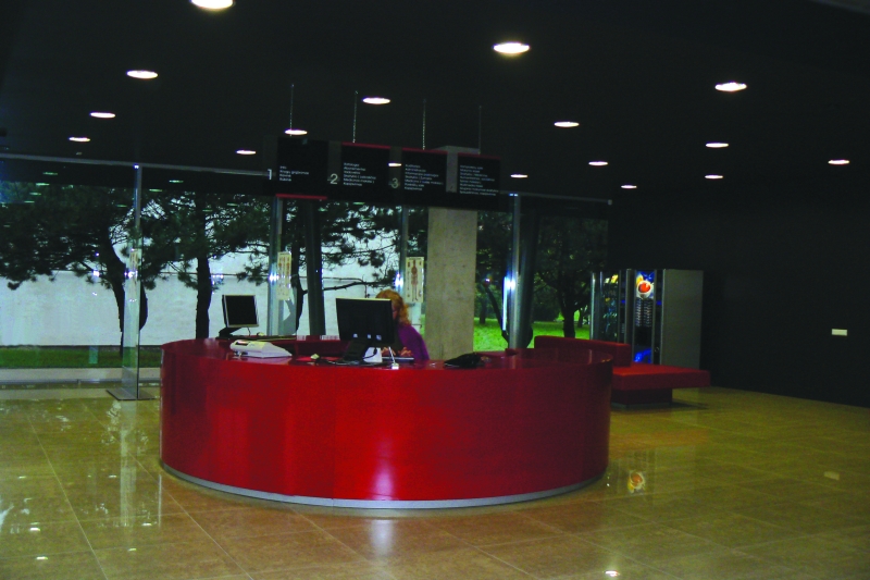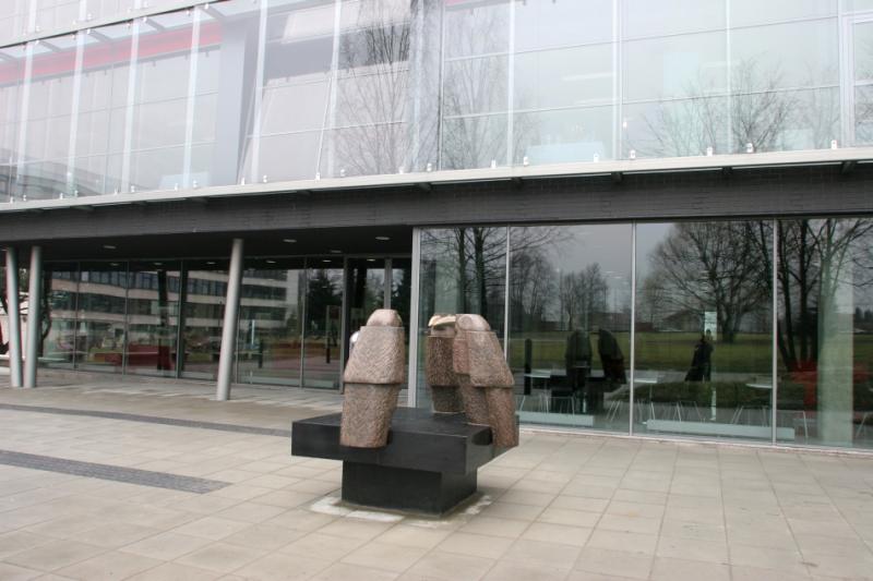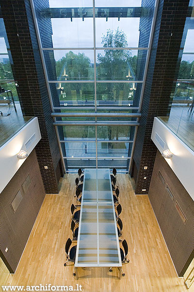 The idea was to transform a traditional library into a “learning tool” where learning and research process could be performed at the library – starting from search for information up to the typography of research work. Minimalism architecture expression of the building exterior is enriched with double glass surfaces and a bay-window on the southern facade. The approaches are decorated with the symbolic sculpture „Consillium“ (Board of Doctors) by stasys Žirgulis. The inside is notably spacious and stylish. Trimmed concrete material leads the idea of exposing materials and offers a succesful combination with stone tiles, tarket flooring, glass and steel. All architectural solutions seem to be though over very carefully like using a purposely motivated interface. A hi-tech impression of the building lies with a tectonically harmonized duet of form and function. (Archiforma: Lithuanian architecture review, 2007, No2, P.21.)