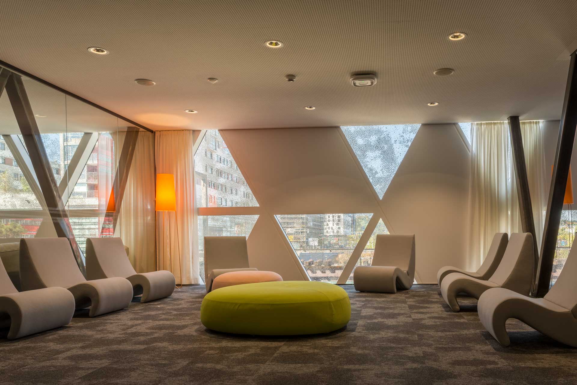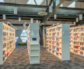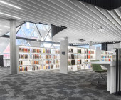 District heating and thermal activated floors; sound-reducing carpets on the floor and acoustic panels on the ceilings; separation of collaborative and individual work spaces on 3 top floors; self-check-in and self-return via book sorting machine; multimedia furniture; tablets included in (illuminated) book shelves; info “desk” designed in a way to abolish the “info-desk-hurdle” by letting users sit or stand next to librarian and to let librarians easily approach and help users.