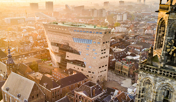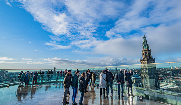 The striking building, which contrasts with the historic city center with its sharp lines like a modern monolith, is 45 meters high, has ten floors and a roof terrace. The building consists of two 'towers', a west and an east tower, which are criss-crossed by escalators. On the top of the building you find a roof terrace with a beautiful view over the city Groningen.