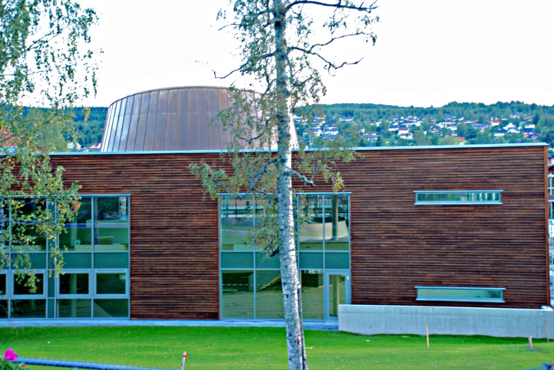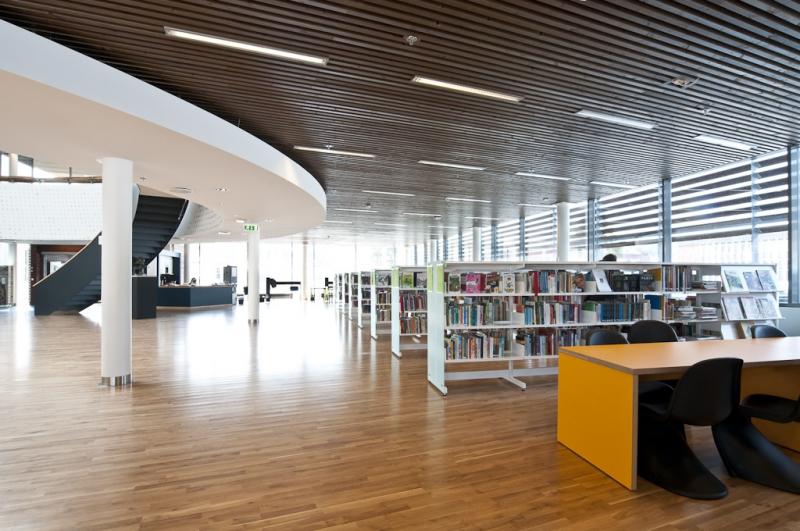 With its striking architecture the library is a signature landmark in the city of Kongsvinger. The building contains two floors with an open solution, creating one large clear space in the centre of the library. Above this space is a circular glass ceiling with incident daylight.