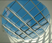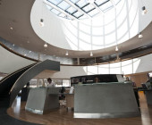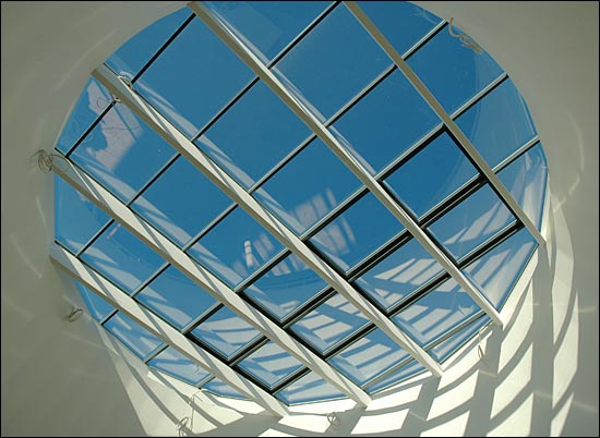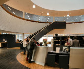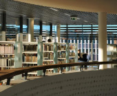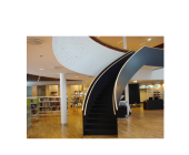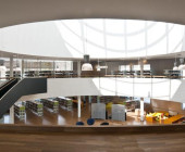 The shifting light has a pleasant effect, constantly changing the experience of the library space. Two sculptured stairs in a half-spiral design lead up to the round circle of the mezzanine.