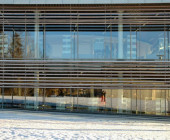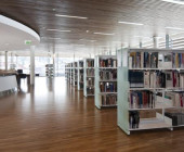 The library has a glass façade facing south and west, making the interior bright and airy. The flooring consists of slate tiles and parquet.
