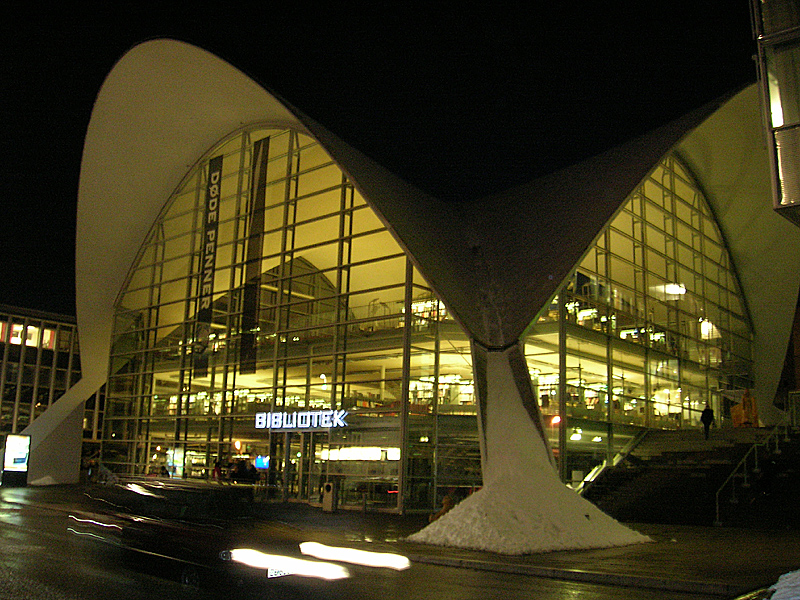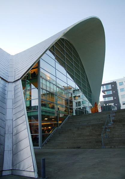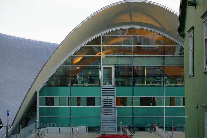 The building is constructed under the original roof of the old Fokus Cinema, which was designed by the architect Gunnar Bøgeberg Haugen and rised in 1969. The extraordinary roof’s structure is based on the mexican architect Candela’s structures, usually named as Candela shell. Formed as four bowed arches it makes an hyperbolic paraboloid form.