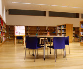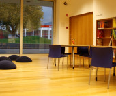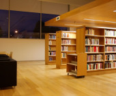 The entrance hall and the multipurpose room are located on the upper floor of the west-east wing. The adult’s lending and multimedia areas are located on the upper floor of the north-south wing, and the children's room on the ground floor.