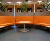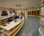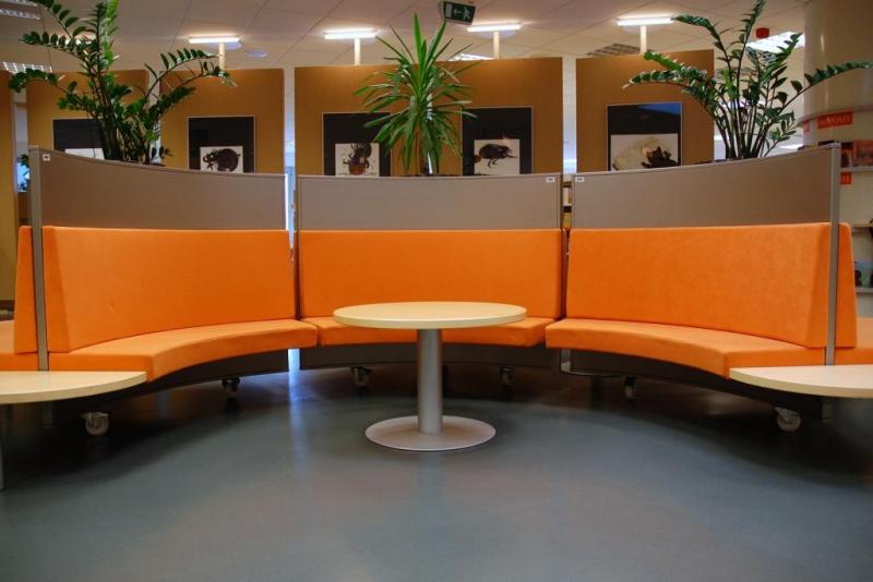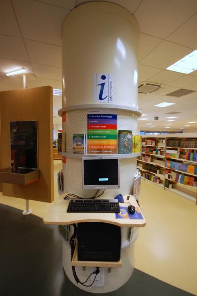 The whole library space is on the same level. The architectural style of Miran Lasić is recognizable by functionally, circularly and elliptically designed furniture. At the entrance there are several large wooden spinning boards used for art as well as photography exhibitions.