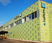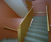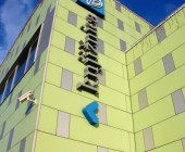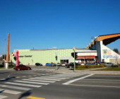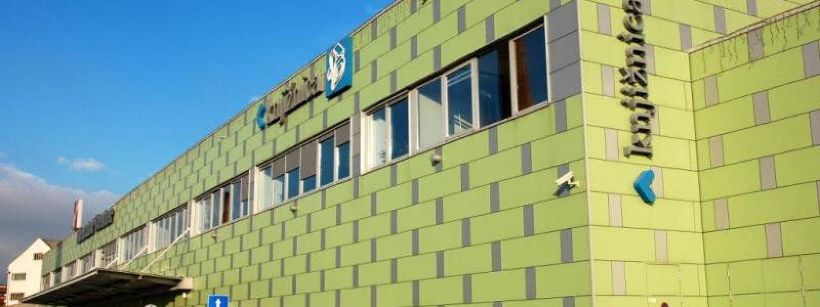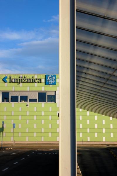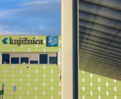Domžale Library is situated on the upper floor of the shopping mall with the football pitch behind it. So the visitors can find the three most important elements of our modern society in one place: a book (library), a shopping trolley (shopping mall) and a ball (football pitch).