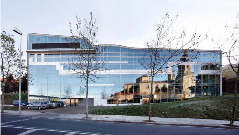 The architect aimed at creating a functional and comfortable building. To do so, he followed two steps. First, the floors were made open-planned, allowing easy circulation between different areas. Second, a glass curtain wall reflects local lanscape and therefore softens the building’s impact over the town. In addition, this light transparent façade contrasts with heavy grey concrete walls that cover the other sides.