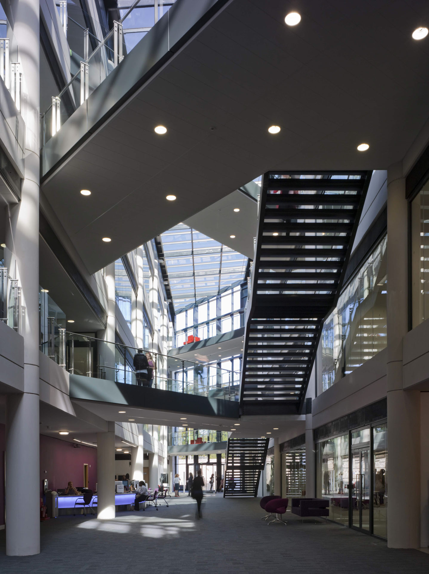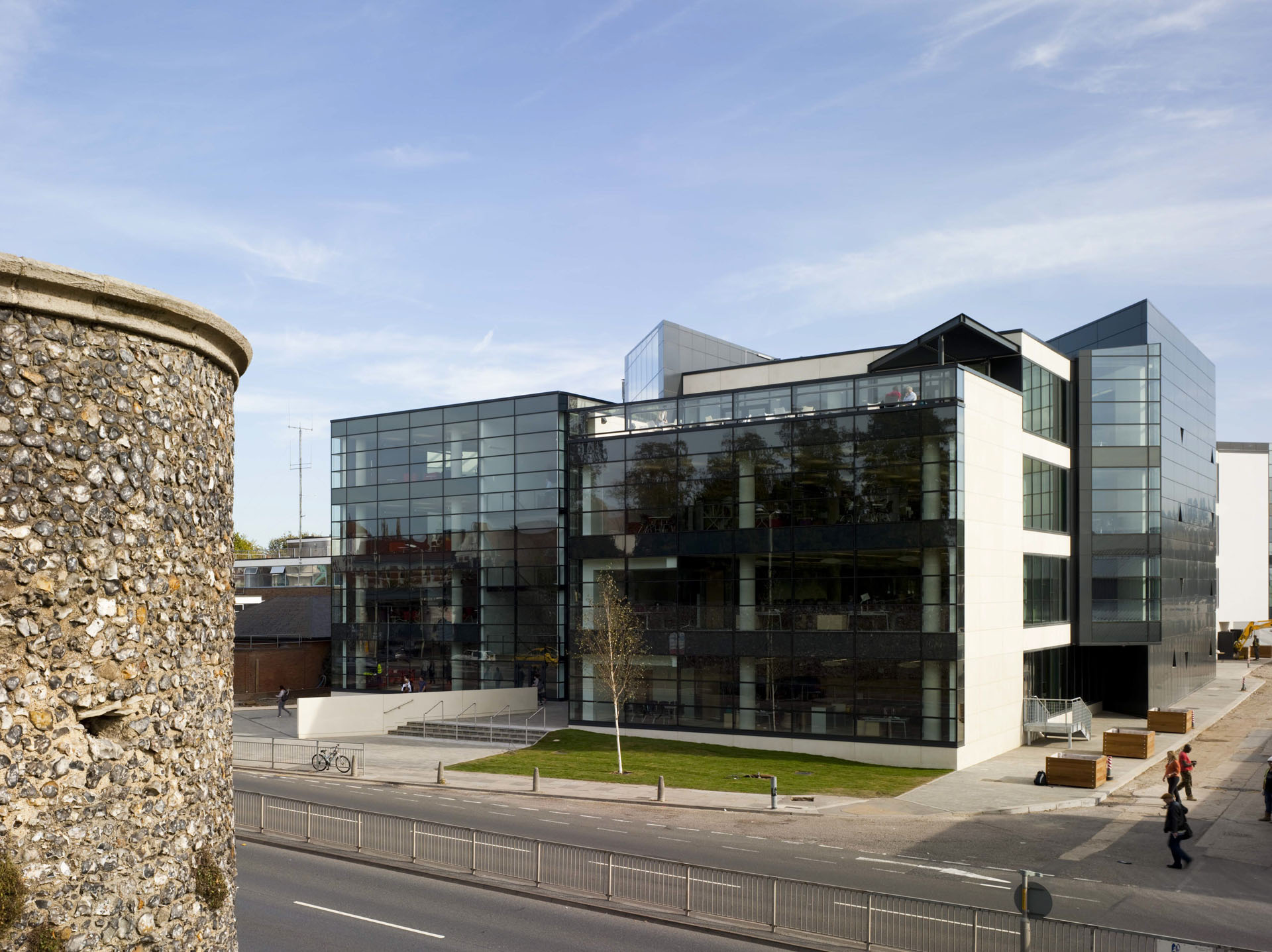 The dynamic character of the building has been expressed by the angular assortment of bridges and galleries that intersect the atrium, linking the buildingās two sides of flexible accommodation. From within the building, stunning new views towards the city walls and the Cathedral can be glimpsed, making visual as well as symbolic connections to Canterbury. The building has achieved a BREEAM rating of āVery Goodā, and was used as the pilot scheme for the BREEAM Higher Education assessment category. The building takes advantage of the natural stable temperature in the earth, using the 258 structural piles as geothermal energy sources, providing over 20% of the buildingās energy. Carbon emissions have been reduced by 23%.