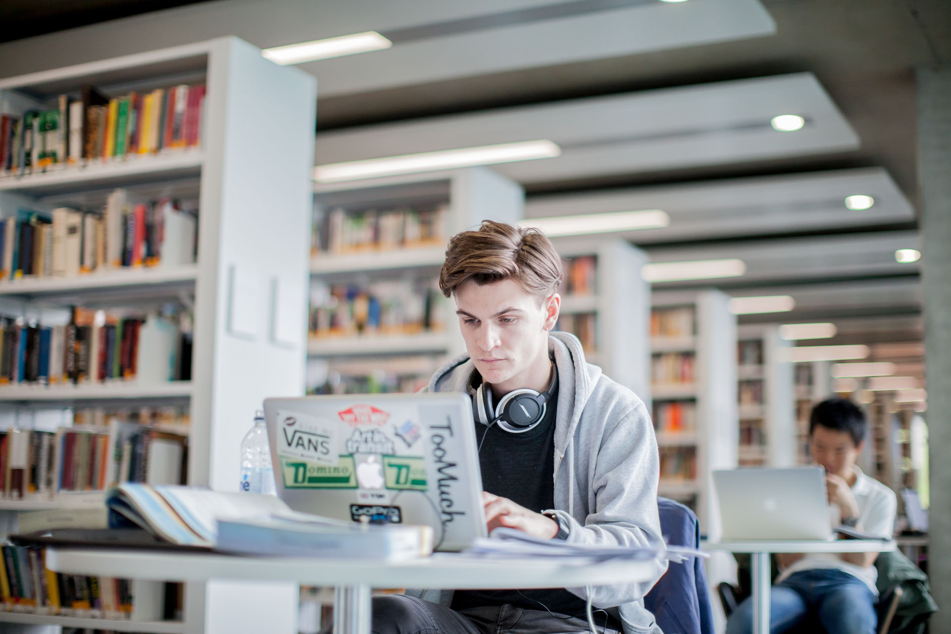 Library offices are located across the floors and support is provided via a HelpZone which includes a coaching area with AV equipment for drop-in tuition or small group introductory sessions. Nearby, a self-service cabinet allows students to borrow Google Chromebooks free of charge. To optimise space, electronic mobile shelving has been used for some of the general collection but its main success has been in the journals, archive and special collections areas.